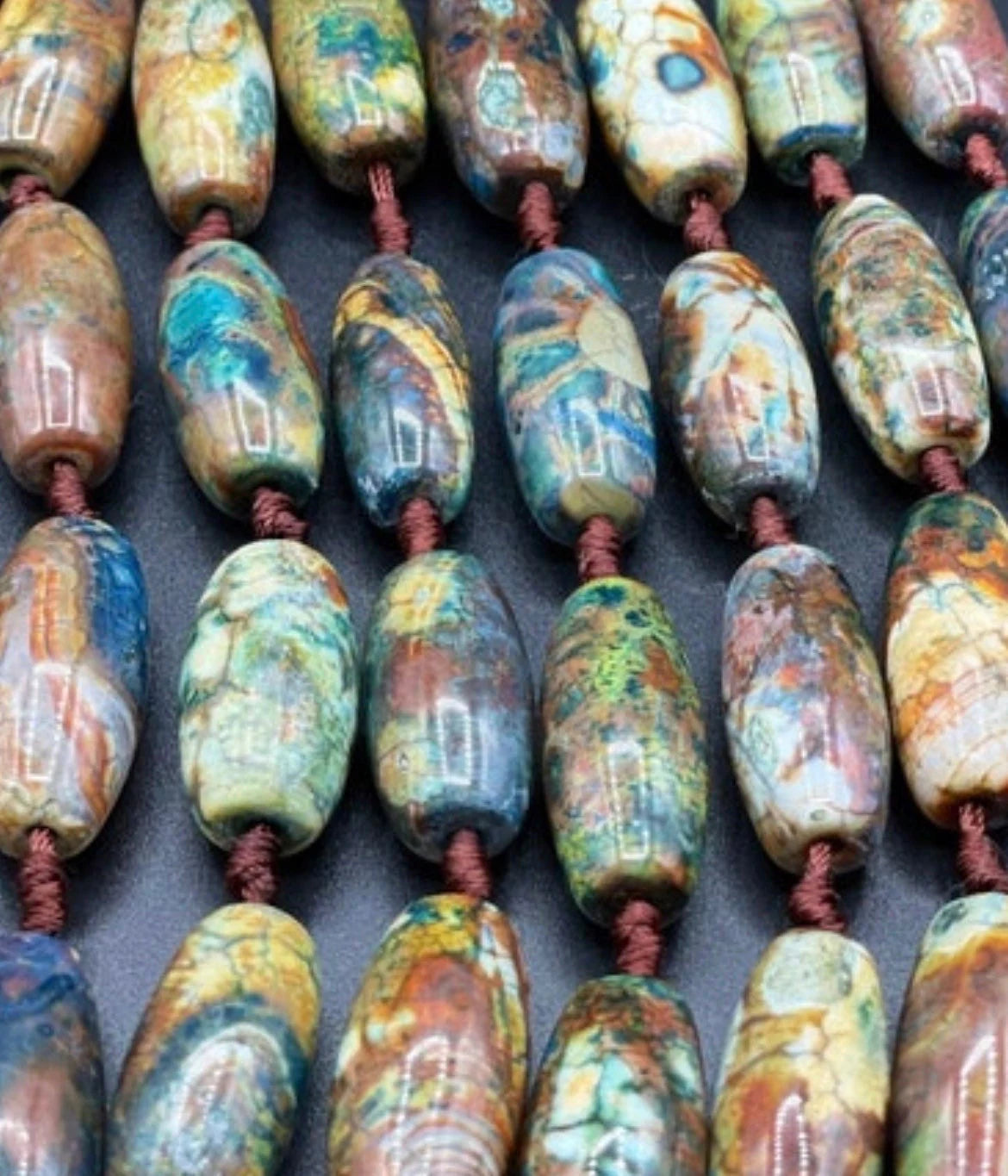 Beautiful natural Tibetan gemstone bead. 12x30mm 12x40mm barrel shape. Gorgeous brown orange blue multi color bead . Unique looking gemstone. Not see on the market …