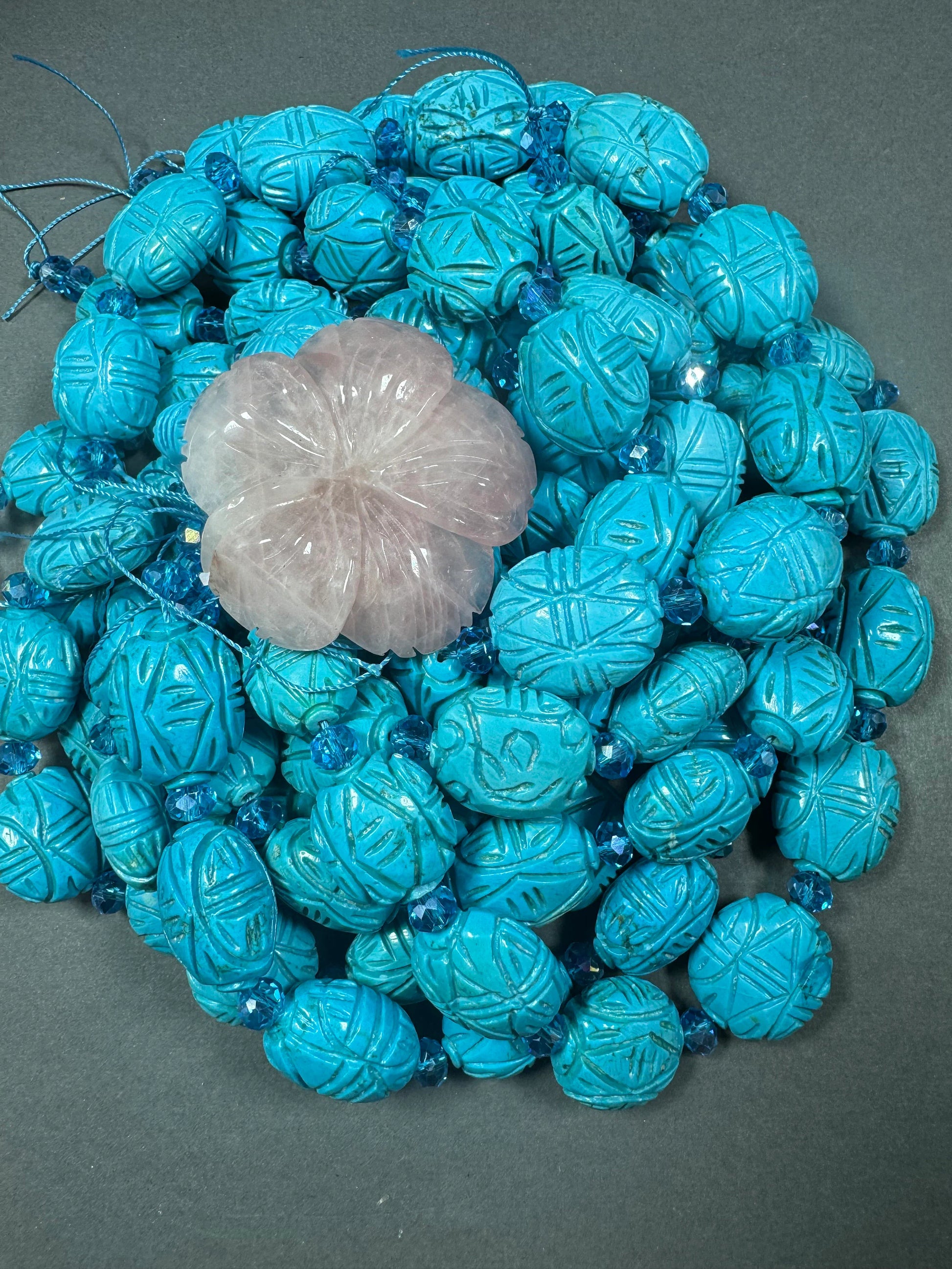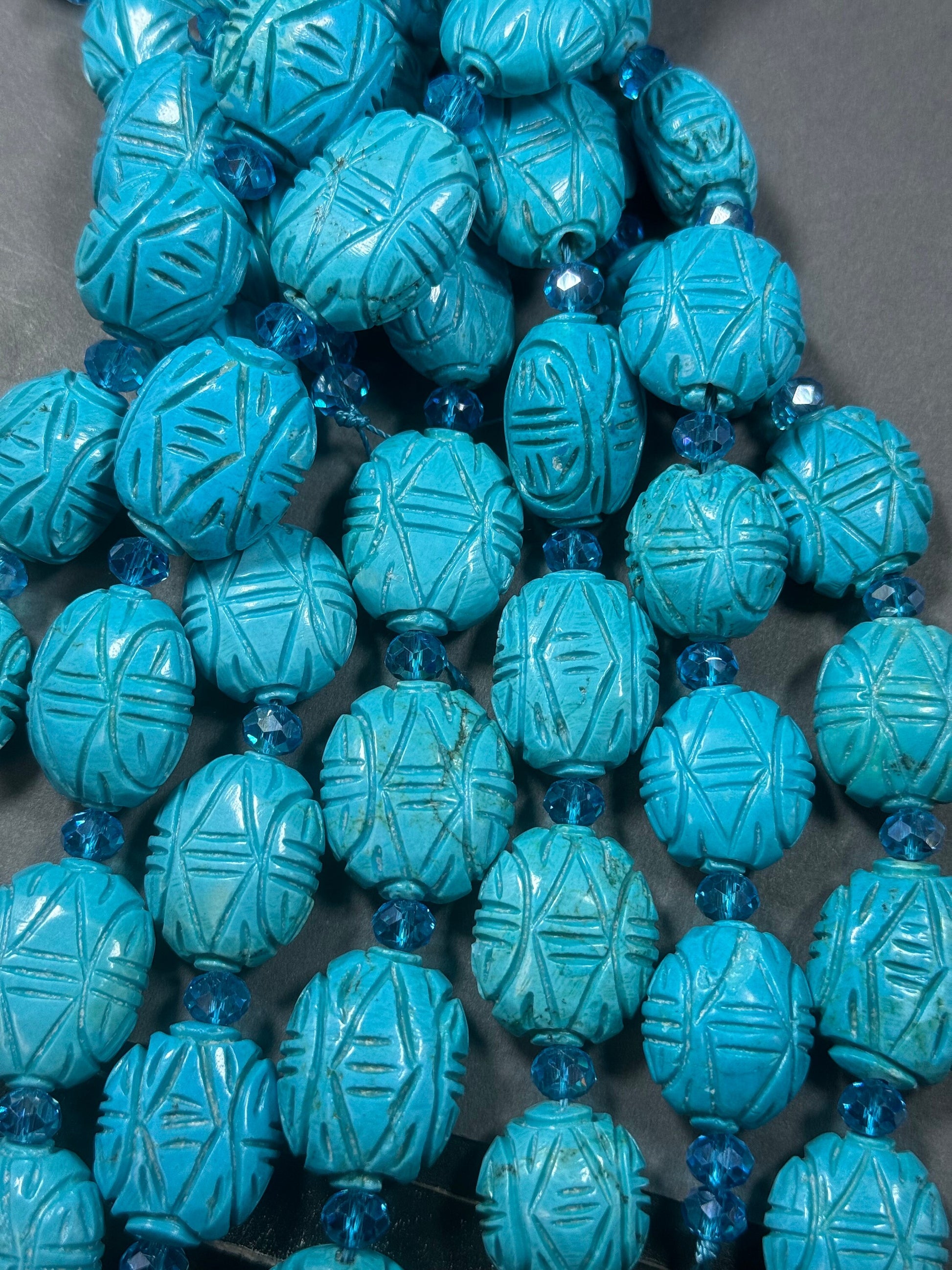 hand carved turquoise gemstone bead . 35mm oval shape . excellent quality blue turquoise beads . full strand 15.5”