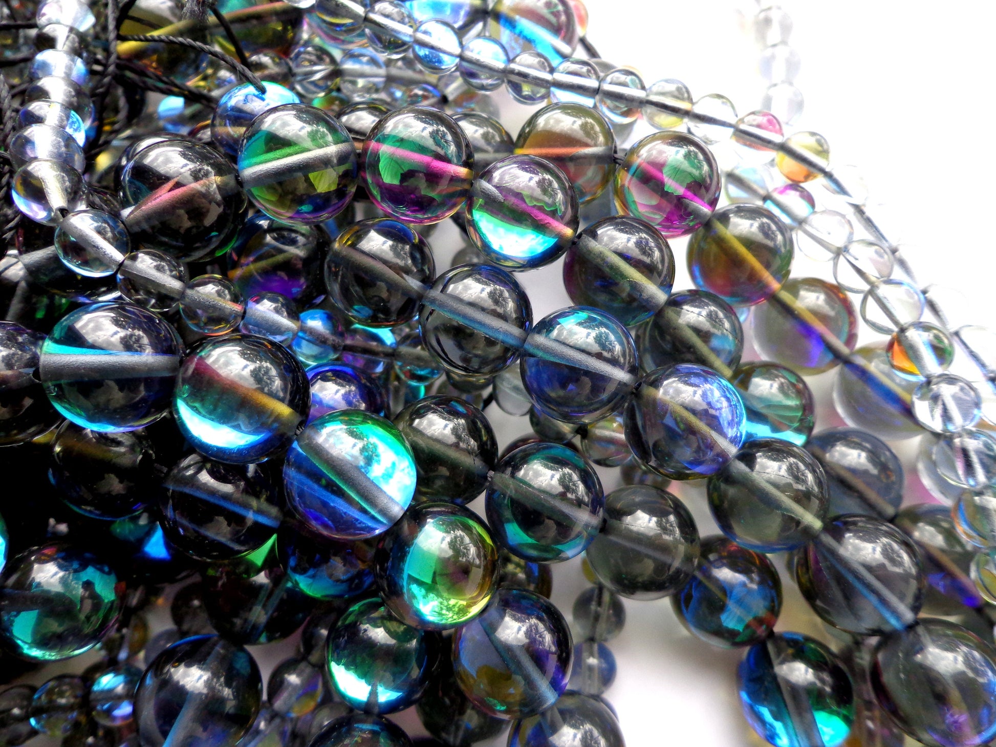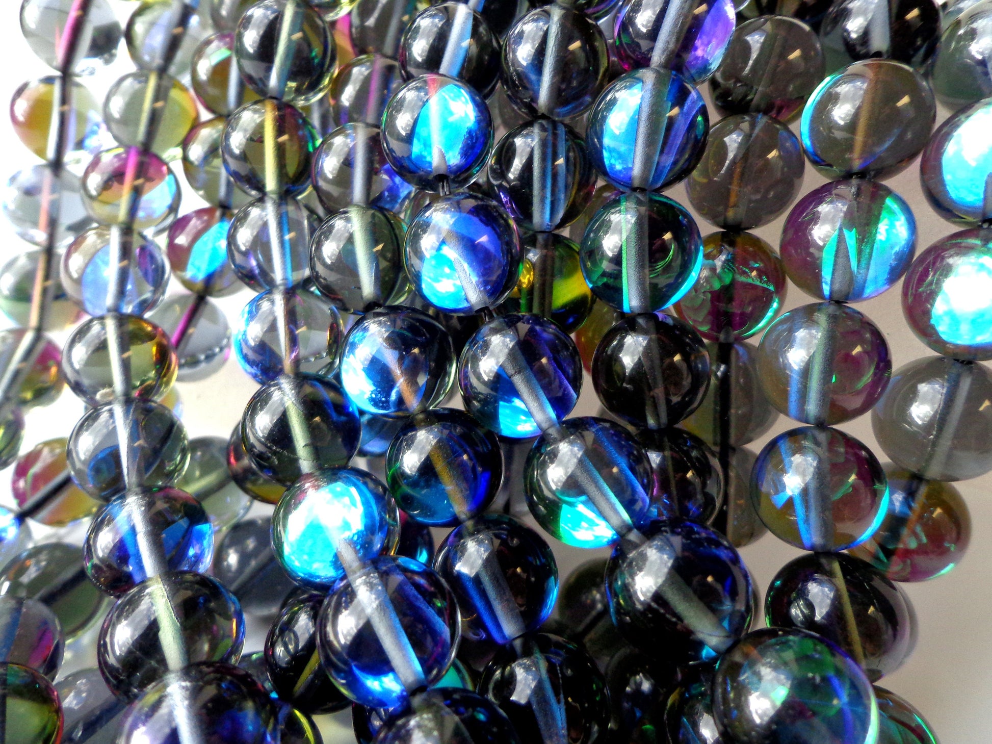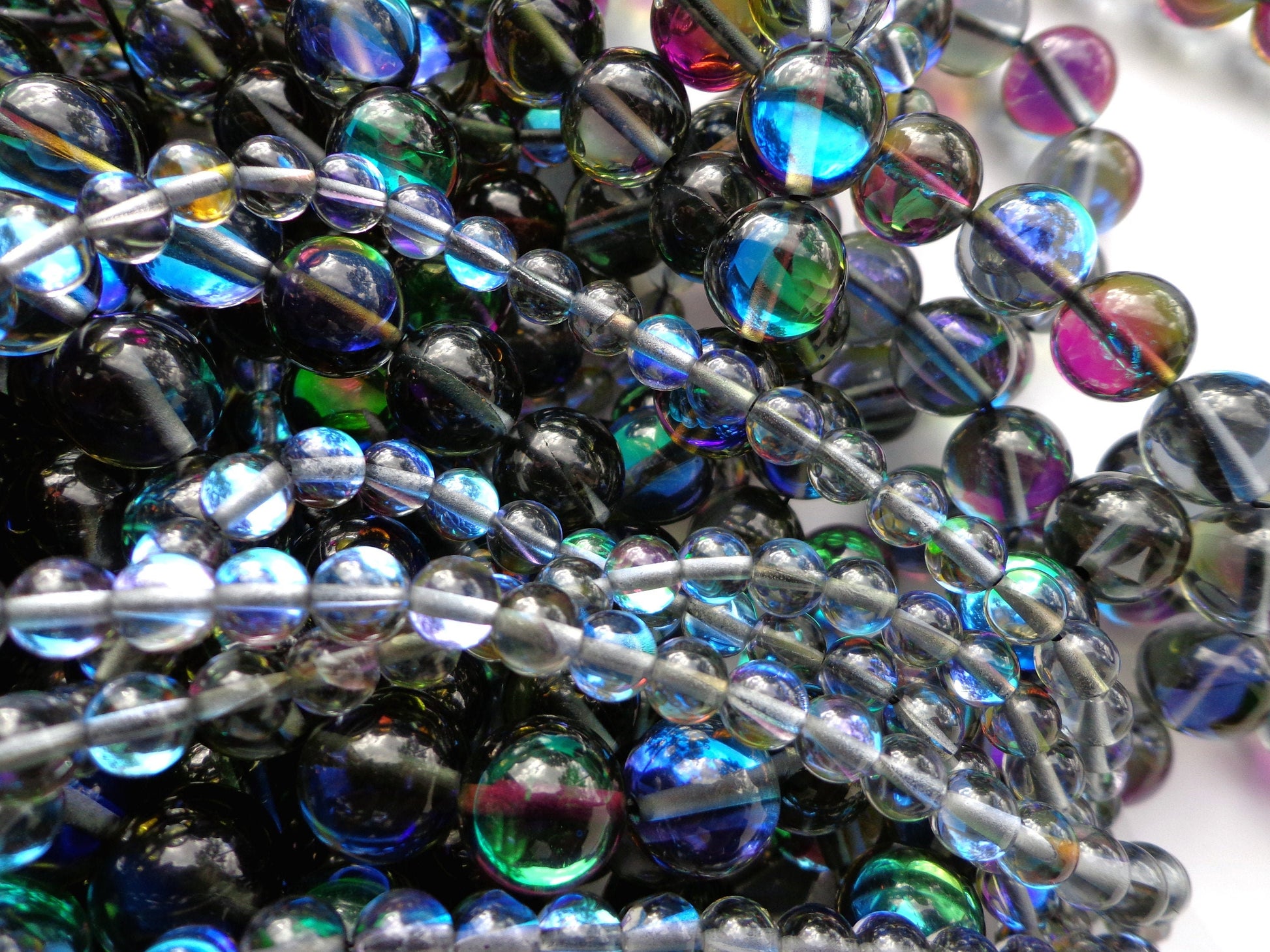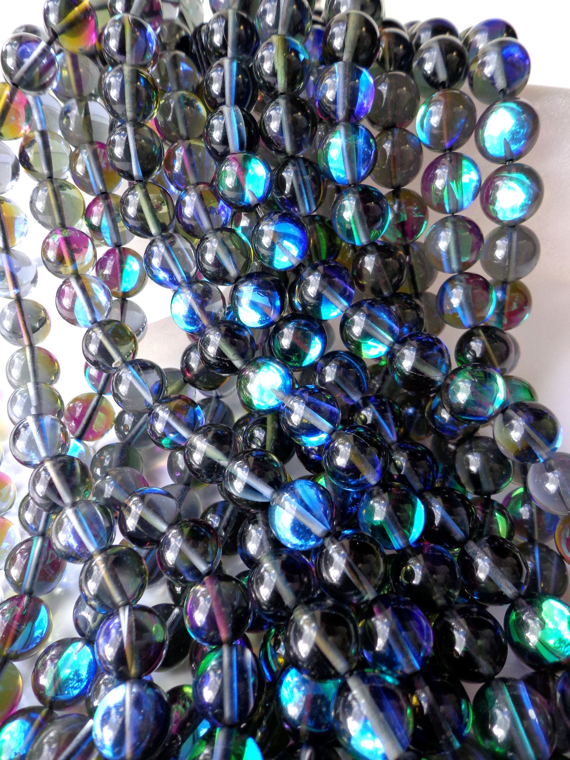 Mermaid Glass Beads 6mm 8mm 10mm 12mm Round Beads, Beautiful Rainbow Gloss Black Mermaid Glass Beads, Full Strand 15.5"
