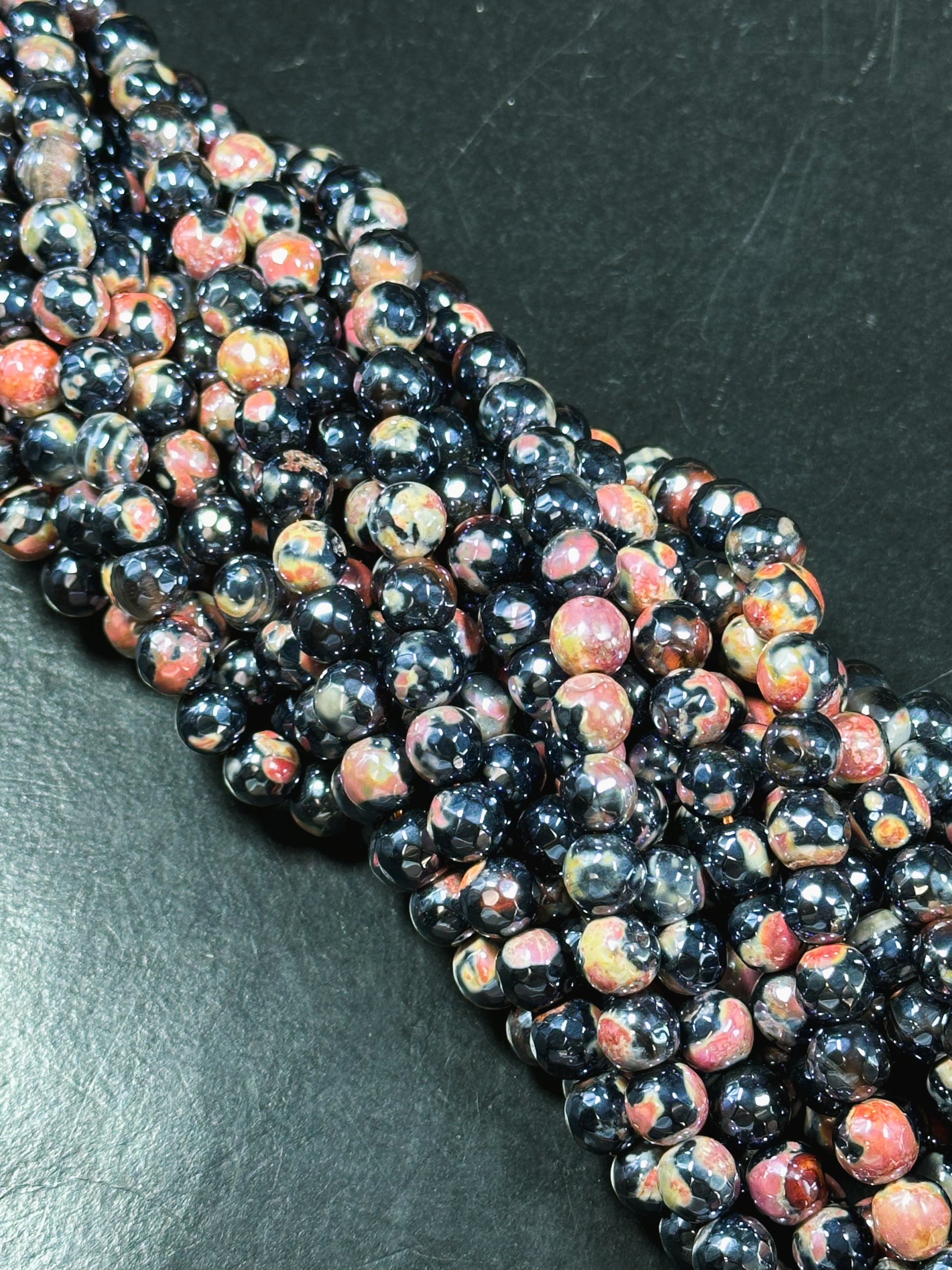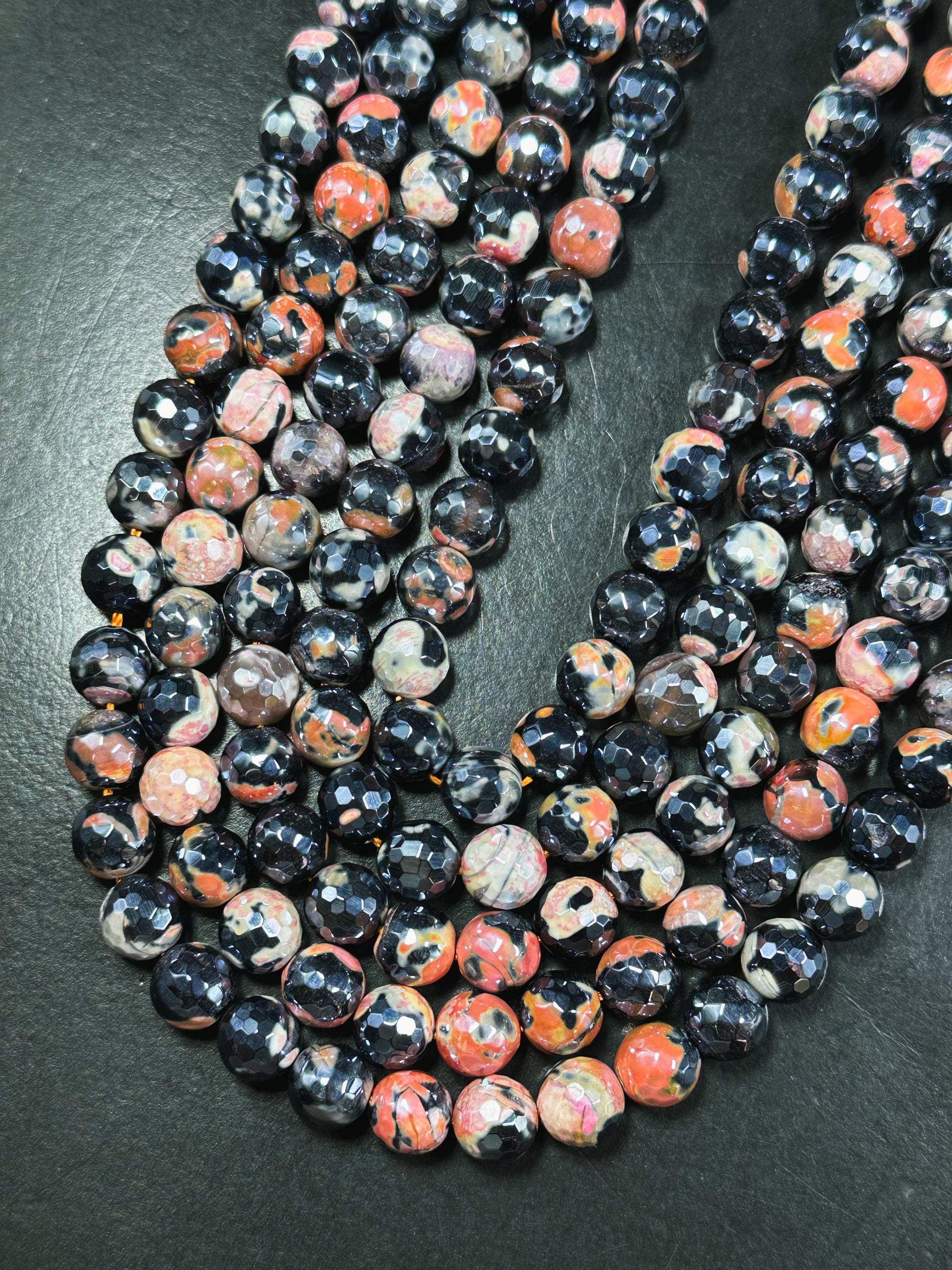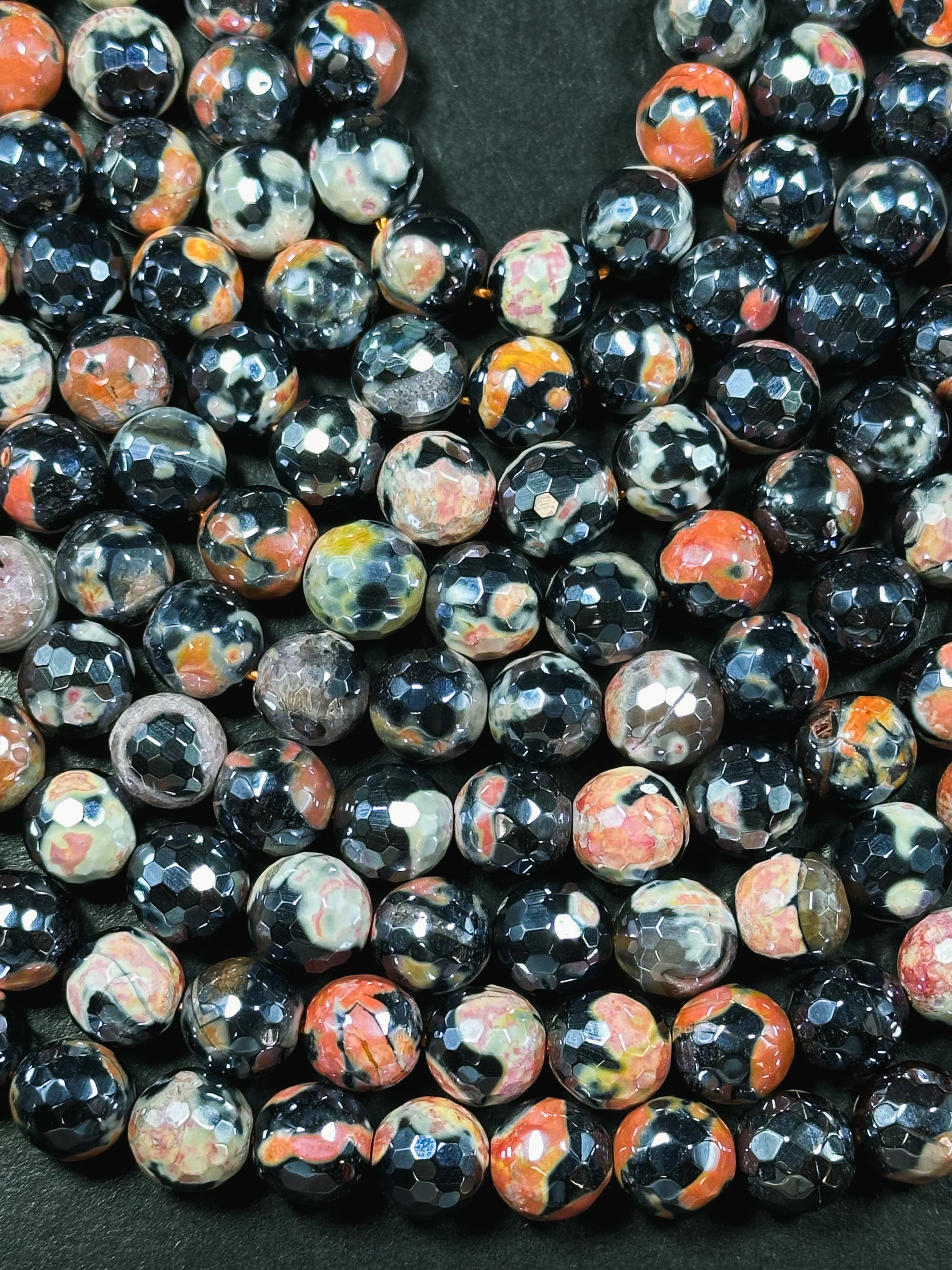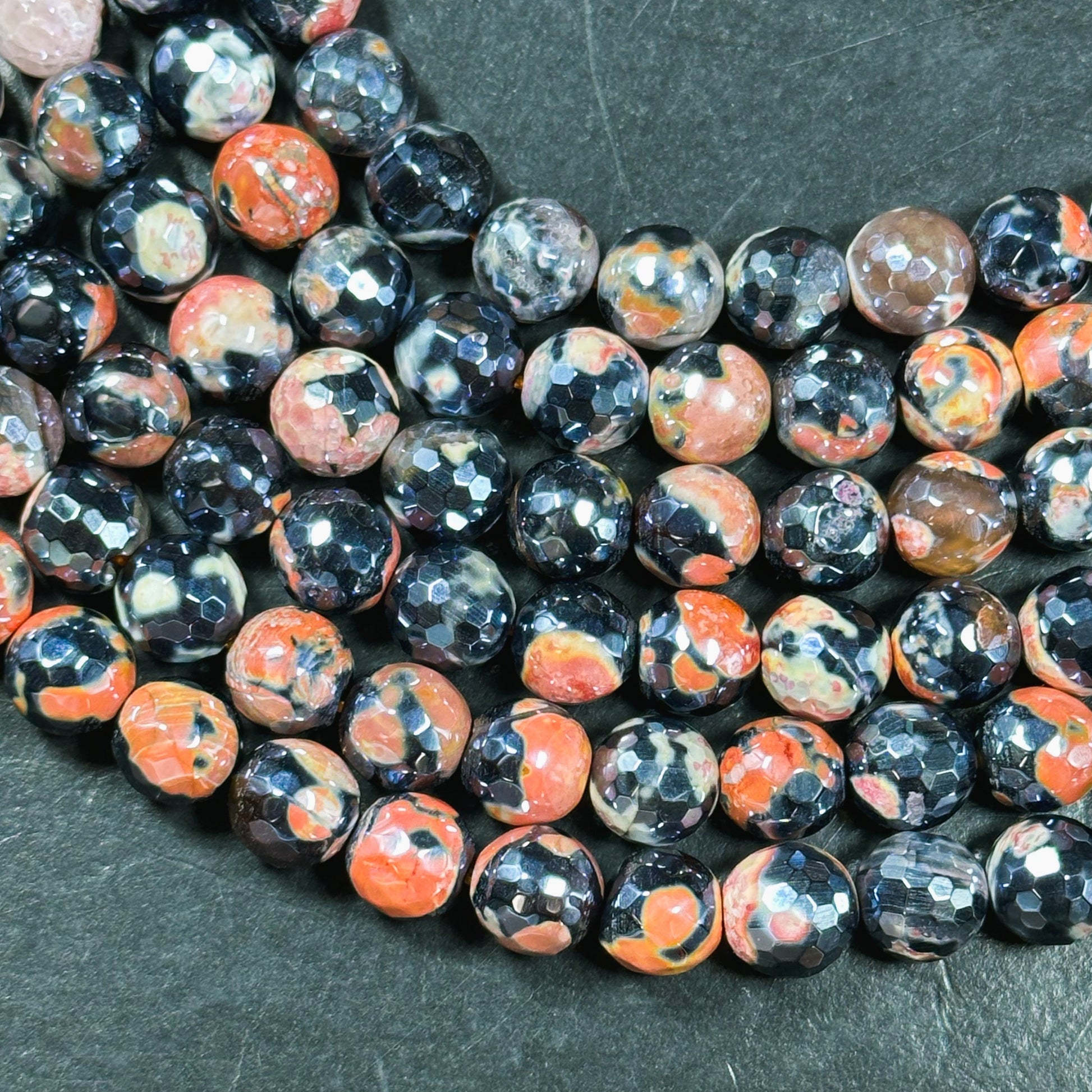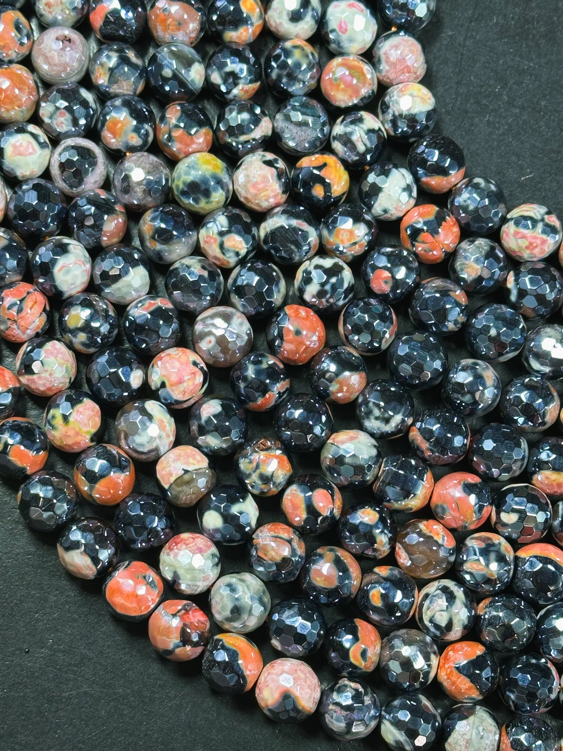 Mystic Natural Tibetan Agate Gemstone Bead Faceted 8mm 10mm Round Beads, Beautiful Mystic Orange Black Agate Stone Beads, Full Strand 15.5"