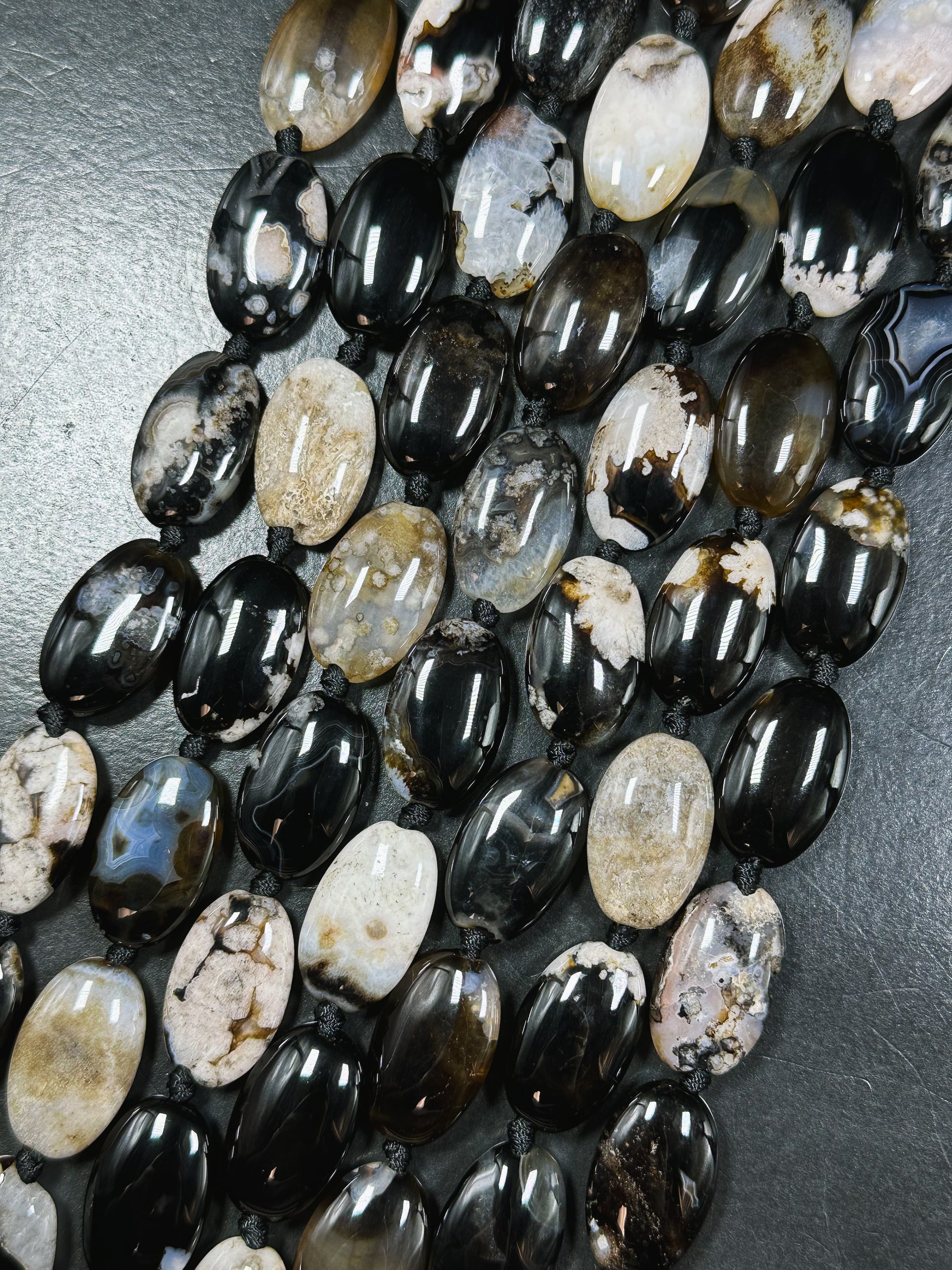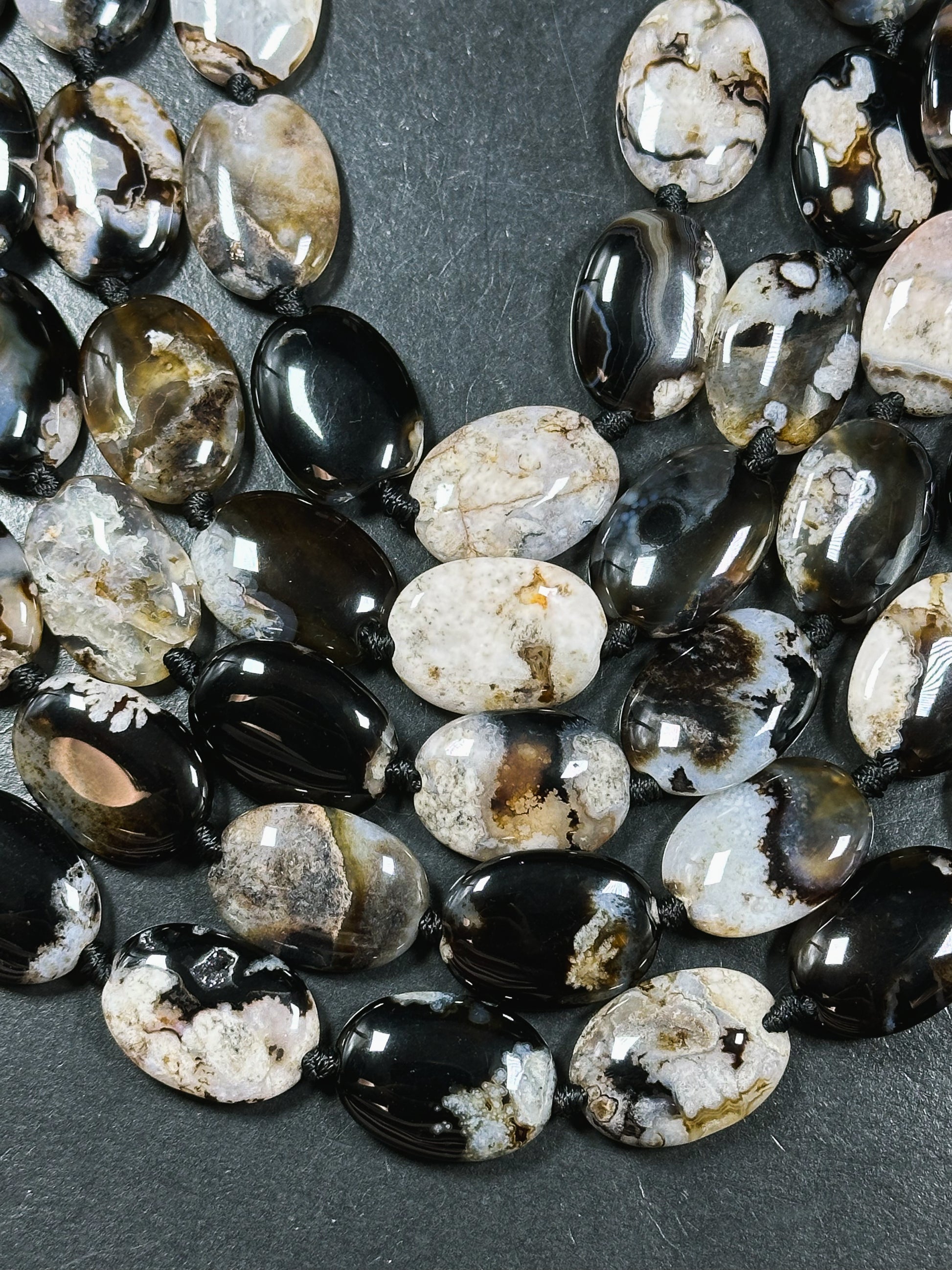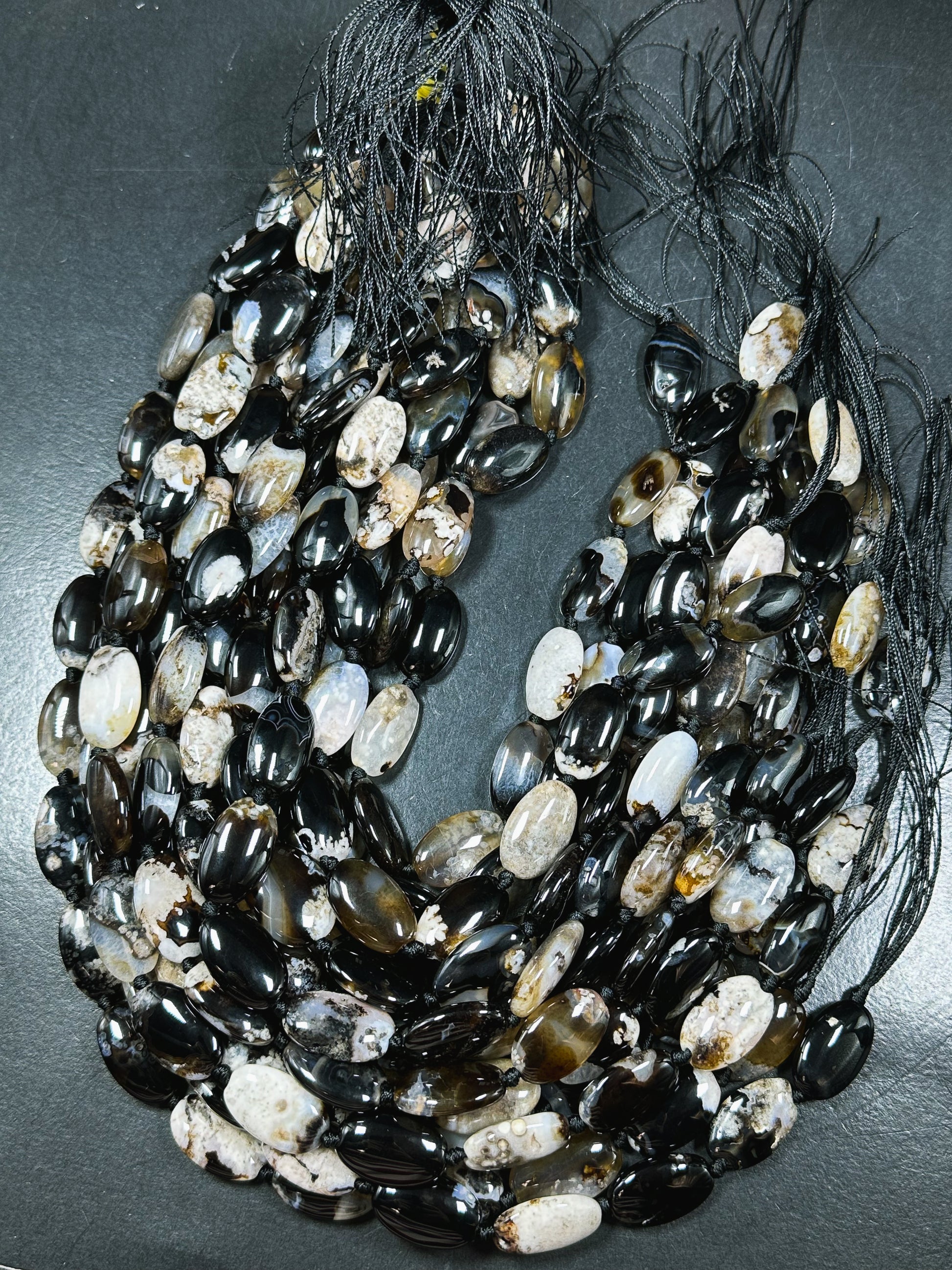 Natural Black Blossom Flower Agate Gemstone Bead, Oval Shape, Gorgeous Natural Black Beige Color Flower Agate Beads, Excellent Quality 15.5"