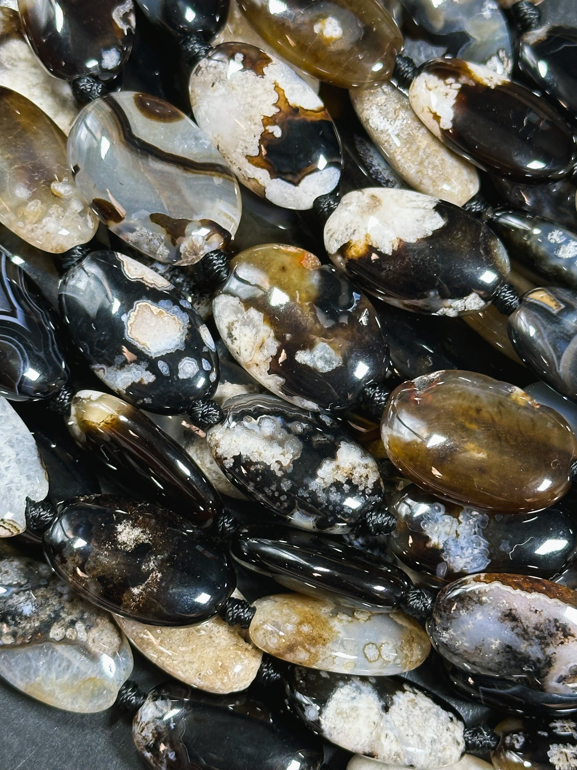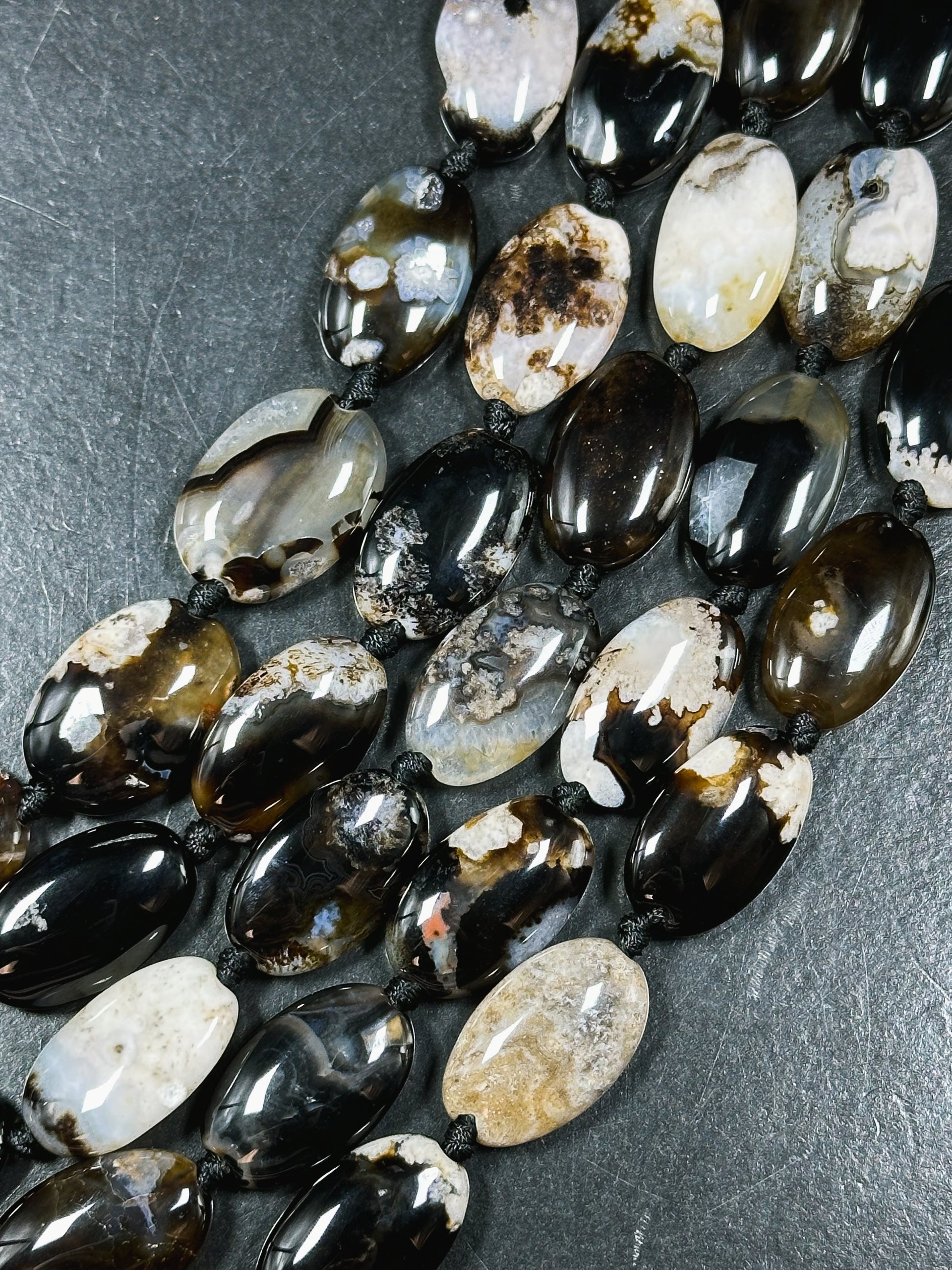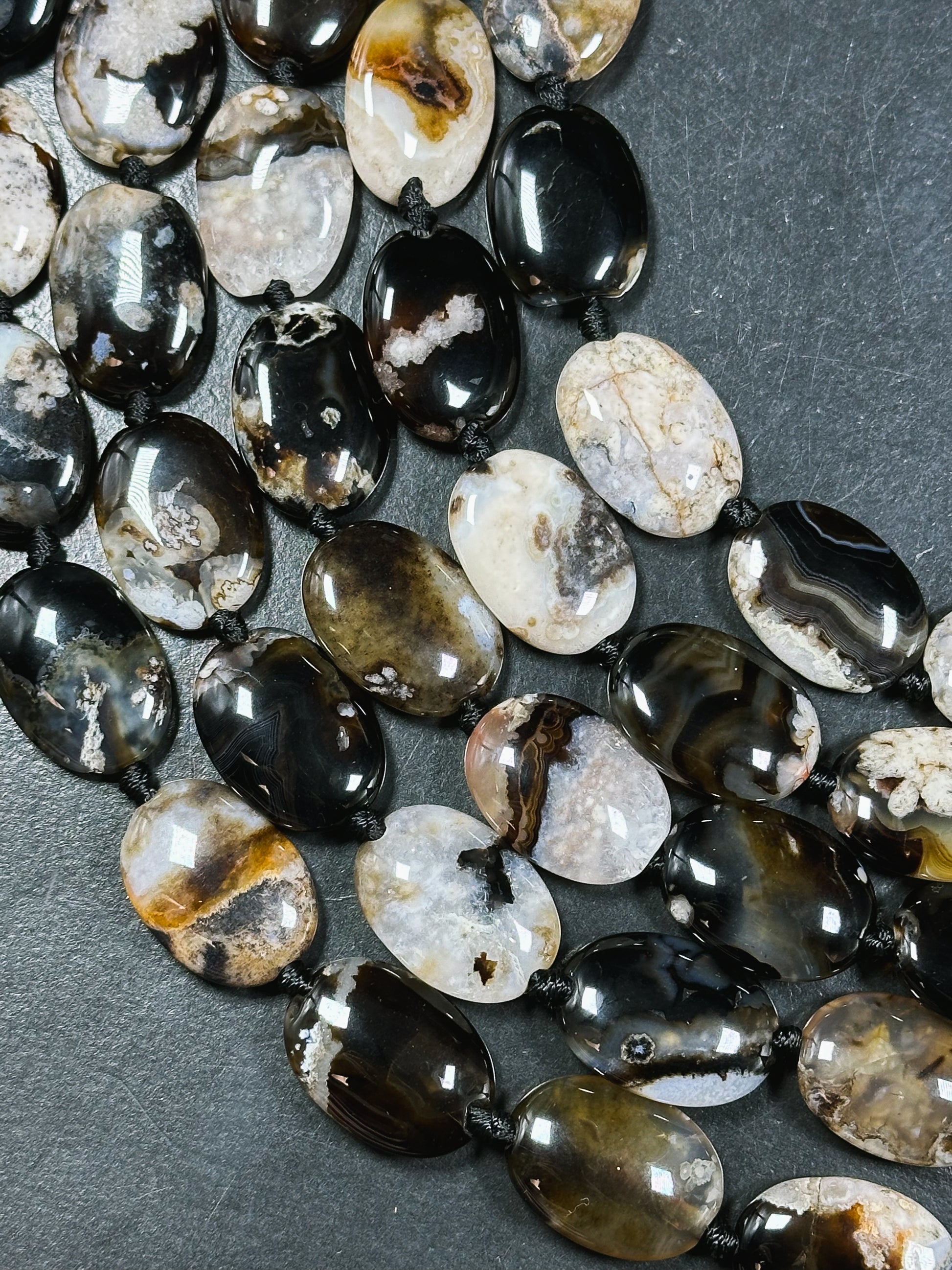 Natural Black Blossom Flower Agate Gemstone Bead, Oval Shape, Gorgeous Natural Black Beige Color Flower Agate Beads, Excellent Quality 15.5"