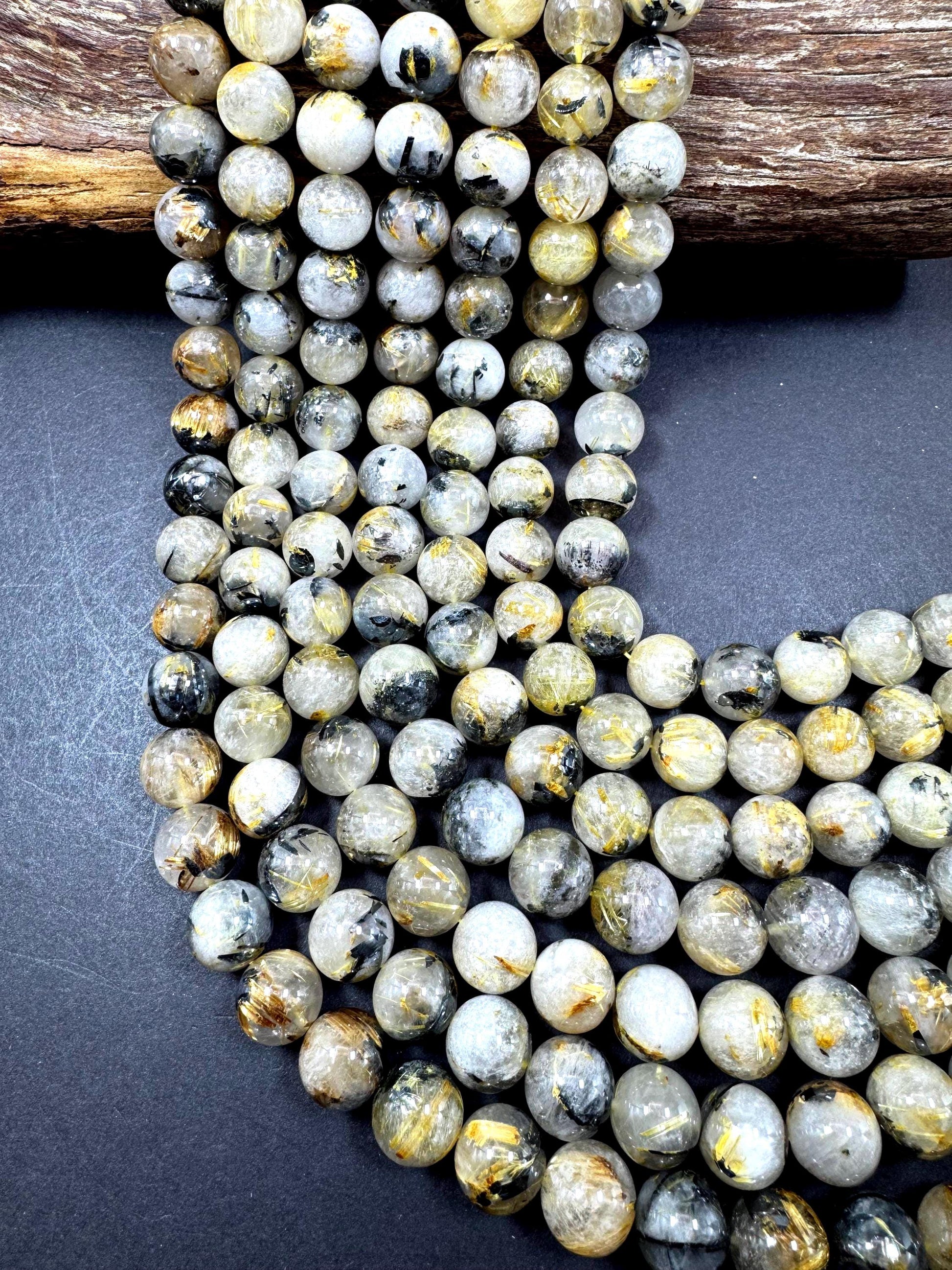 Guaranteed 100% natural rutilated quartz gemstone beads. 6mm 8mm 10nm 12mm 14mm round bead. Super nice quality . Beautiful natural gold color with black. Unique gem stone bead.