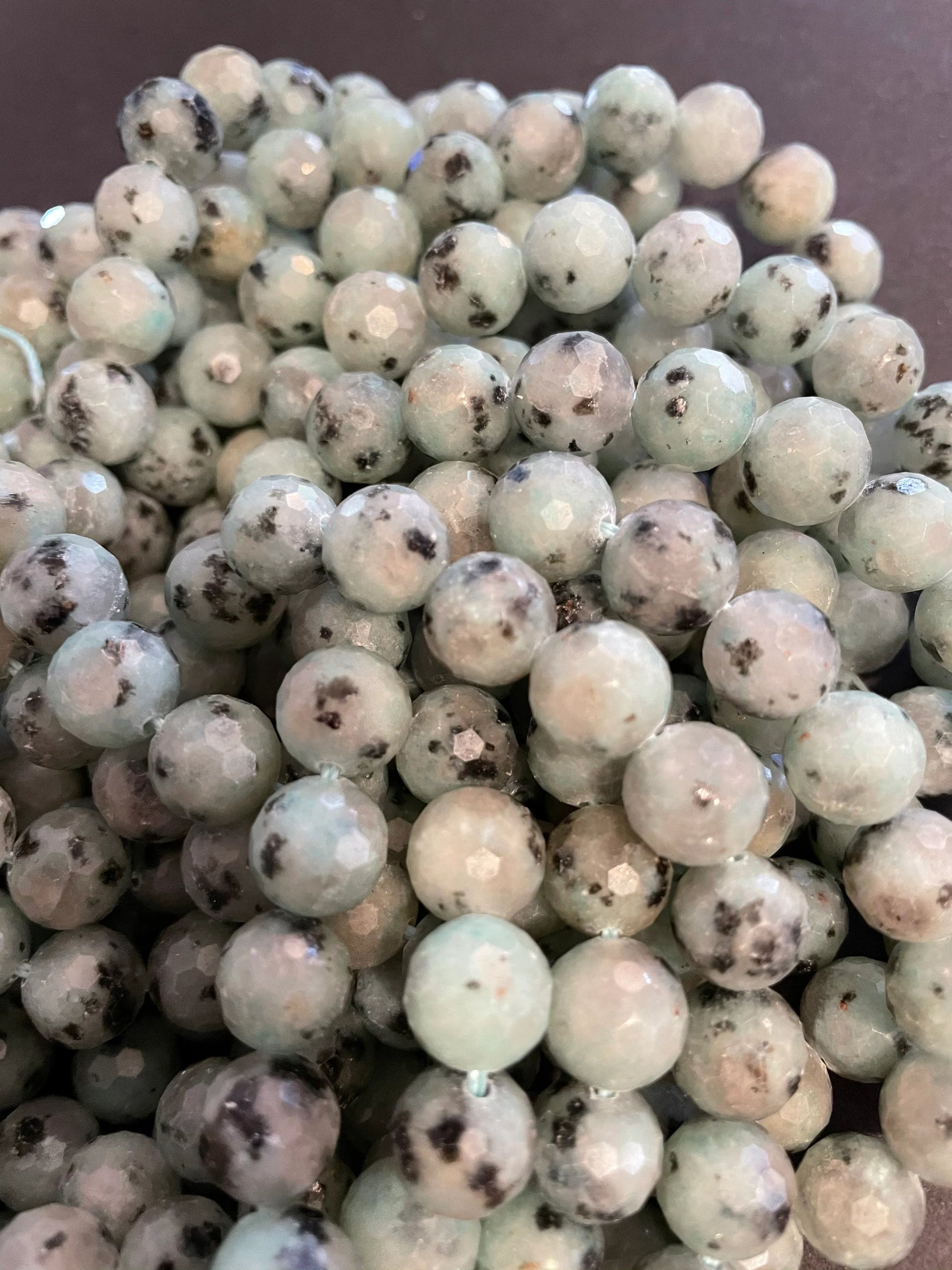 Natural kiwi jasper bead. Faceted diamond cut round gemstone bead. Great for jewelry making. Beautiful light green black dots natural color bead. High quality bead!