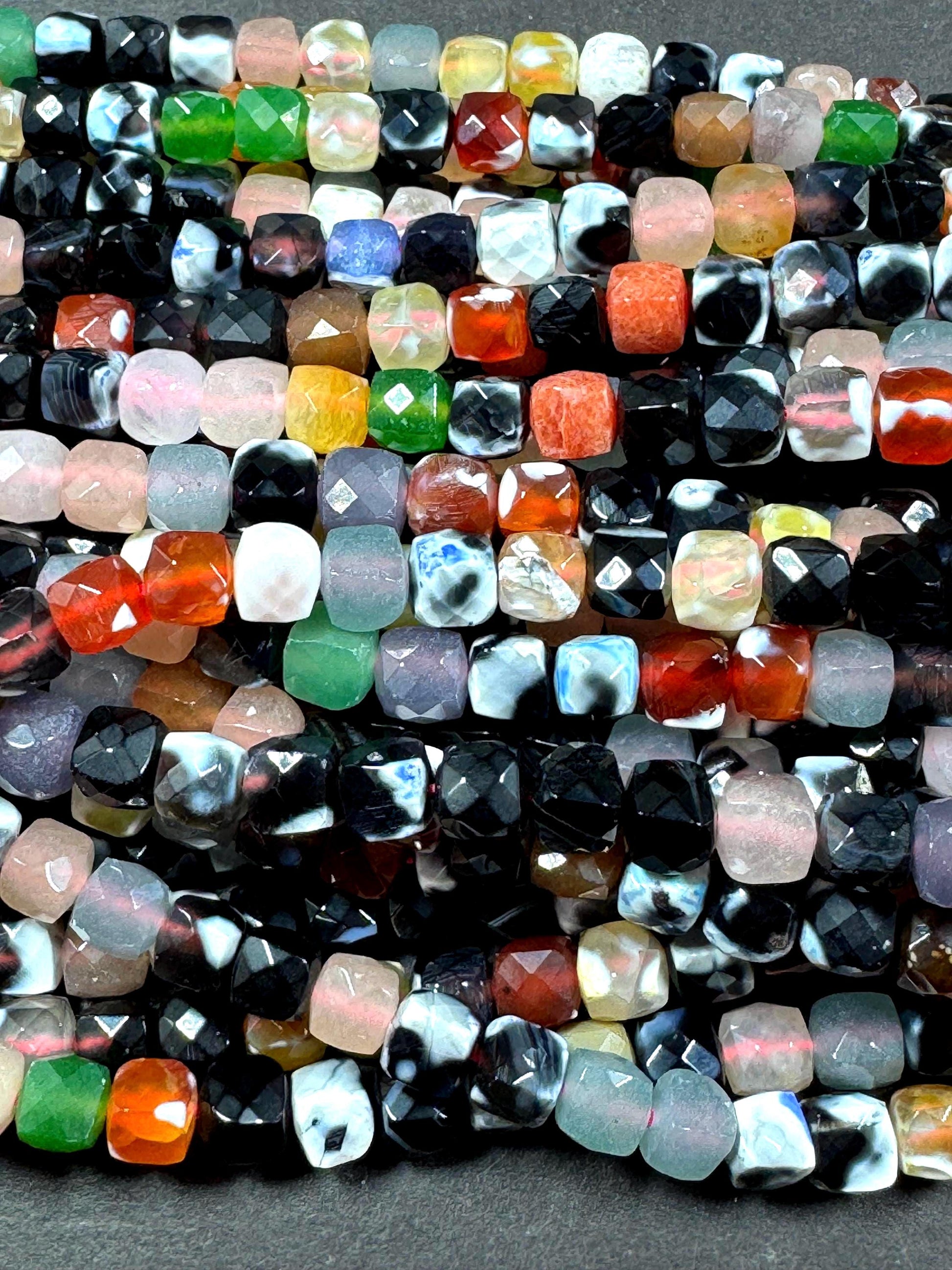 Natural multi color gemstone bead. cube shape . beautiful black with white red green multi color agate bead. excellent quality full strand