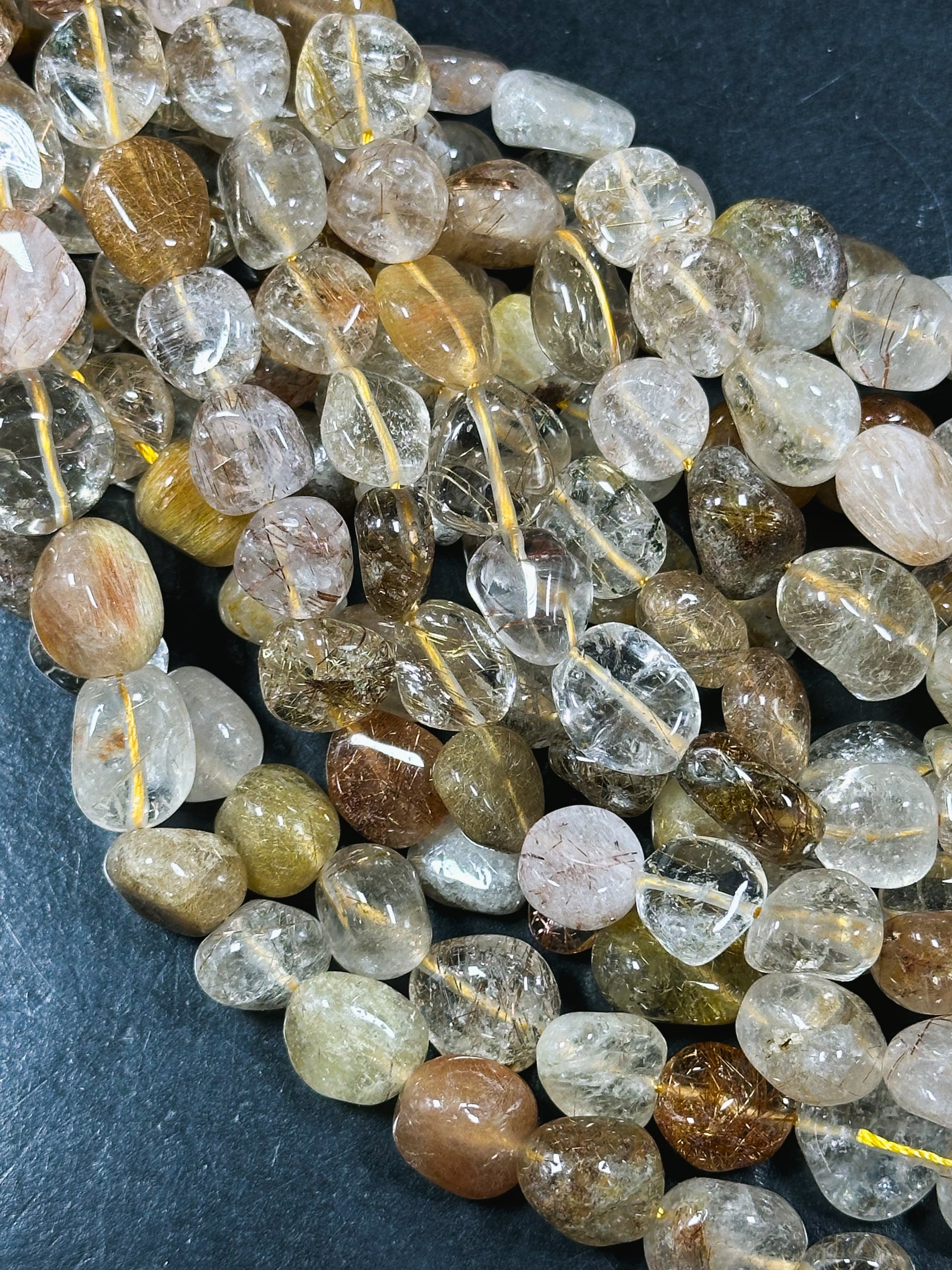 Natural Rutilated Quartz Gemstone Bead 10-13mm Freeform Pebble Shape, Gorgeous Natural Color Rutilated Quartz Excellent Quality 15.5" Strand