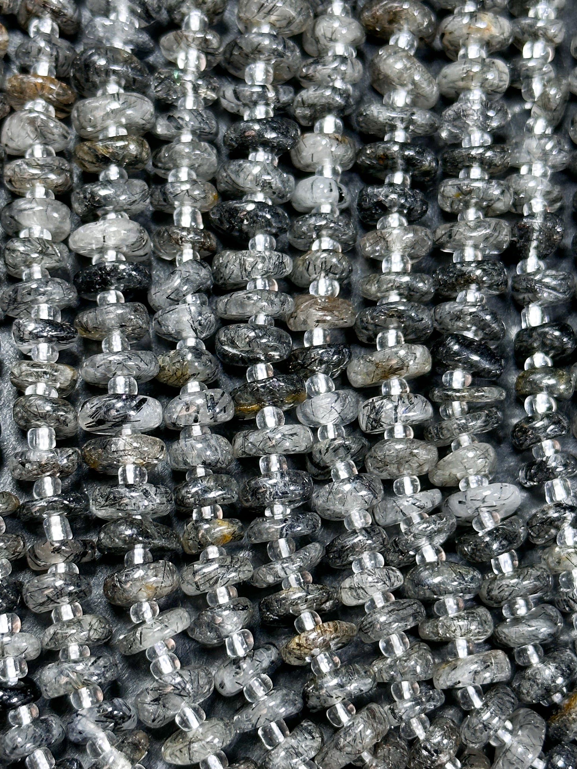 NATURAL Rutilated Quartz Gemstone Bead 7-9mm Freeform Rondelle Shape Beads, Beautiful Black Gray Color Black Hairs Loose Bead 15.5" Strand