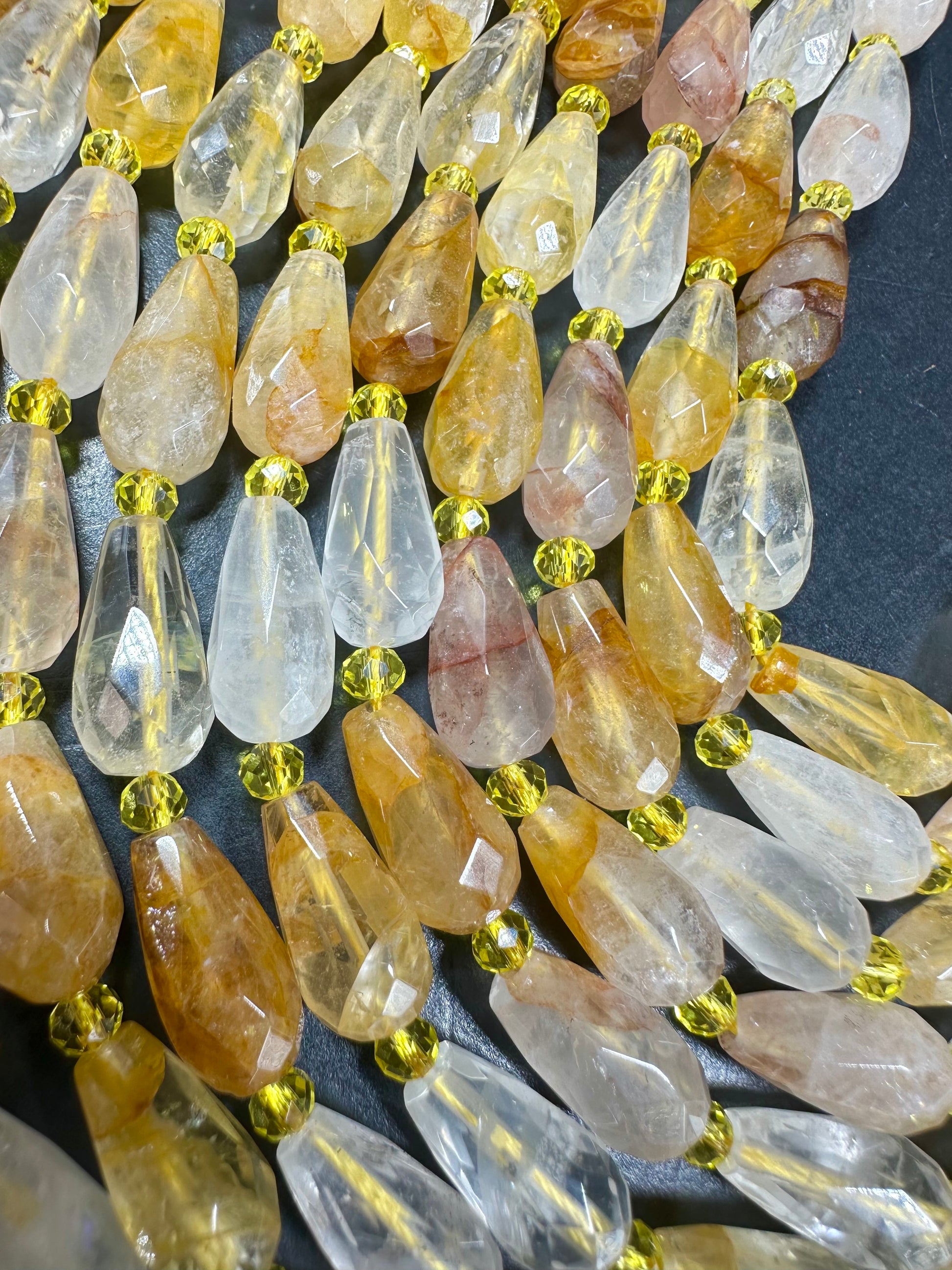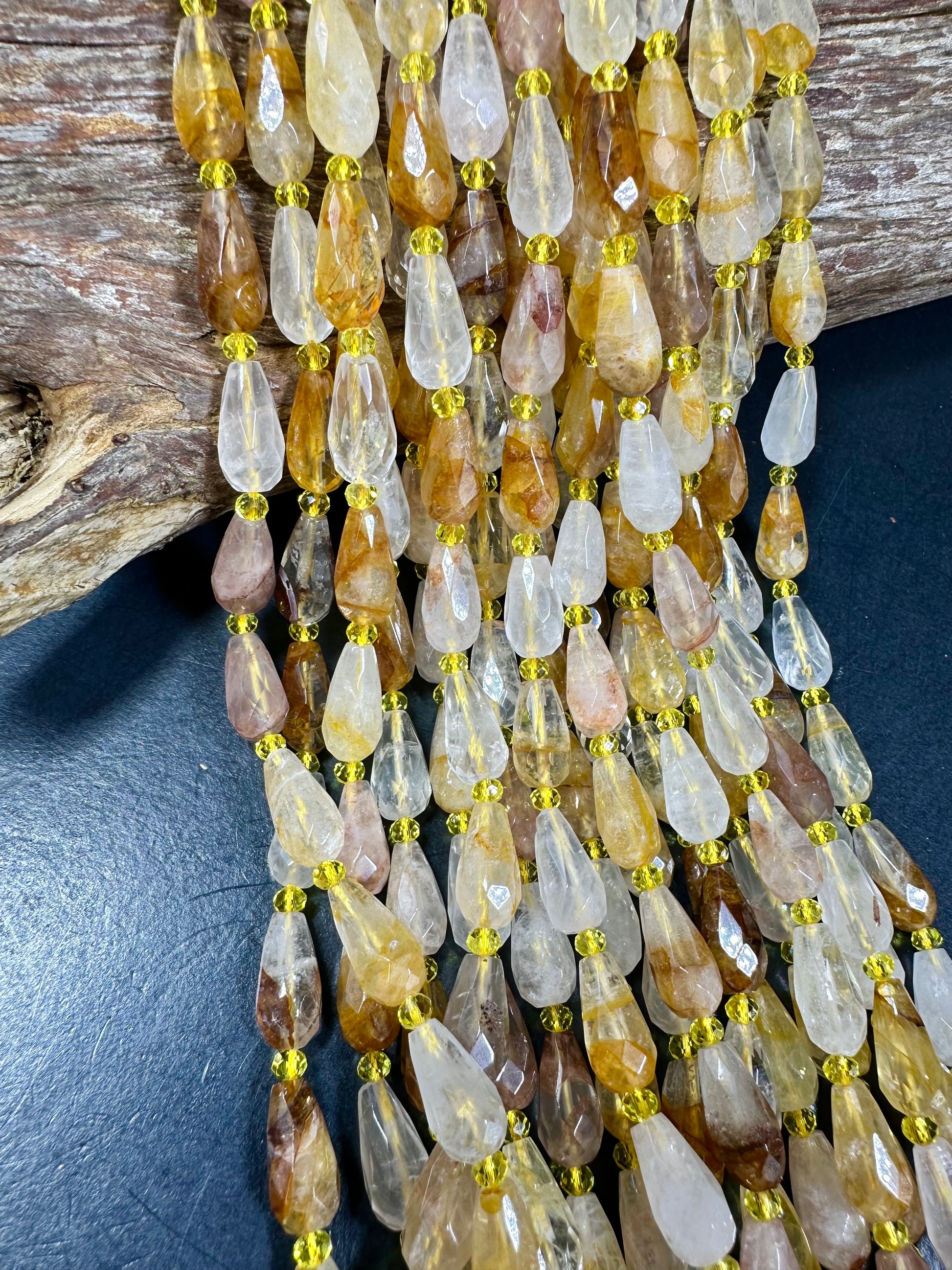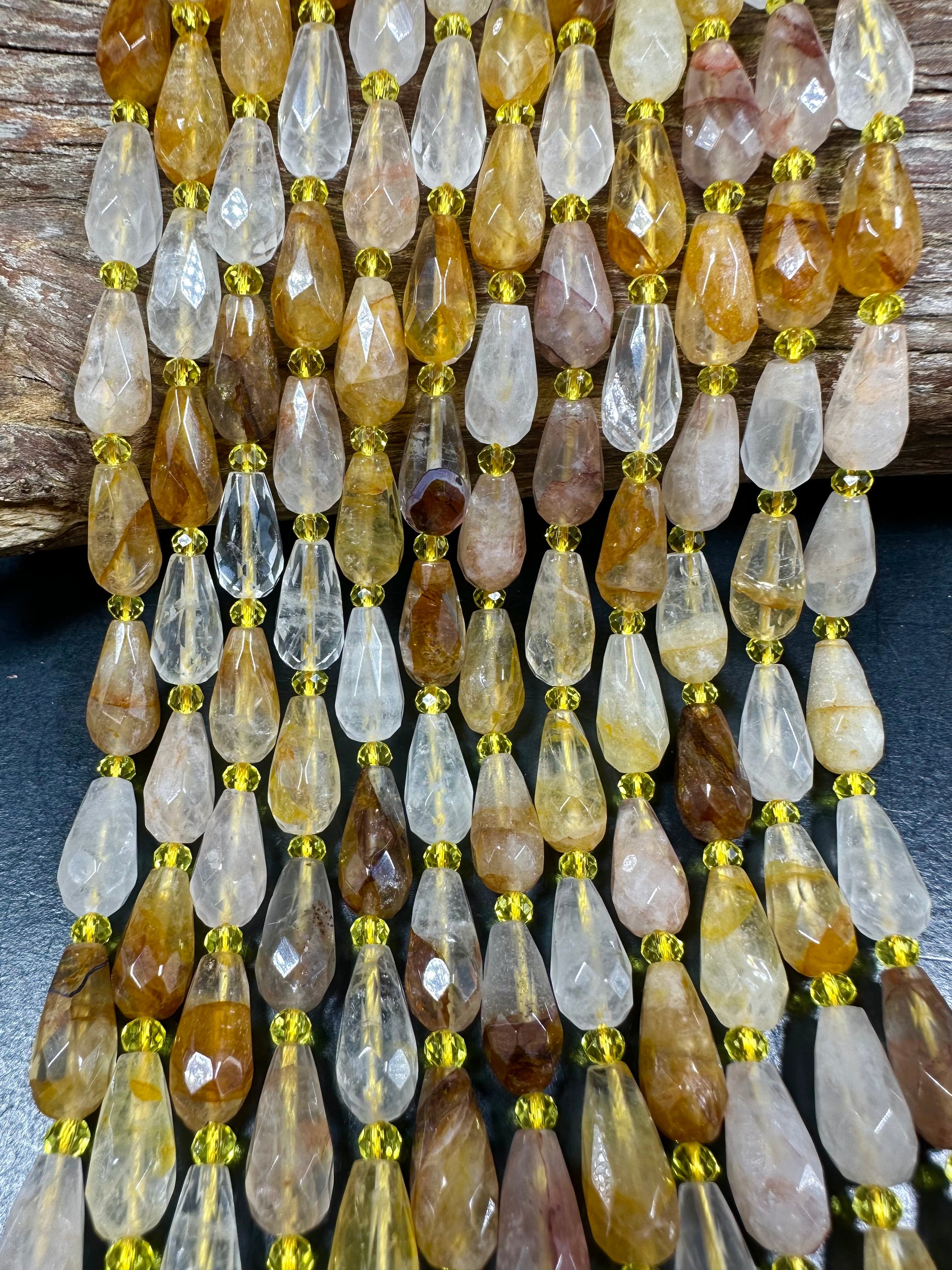 NATURAL Rutilated Quartz Gemstone Bead Faceted 15x8mm Teardrop Shape Beads. Beautiful Gold Yellow Color Quartz Full Strand 15.5"