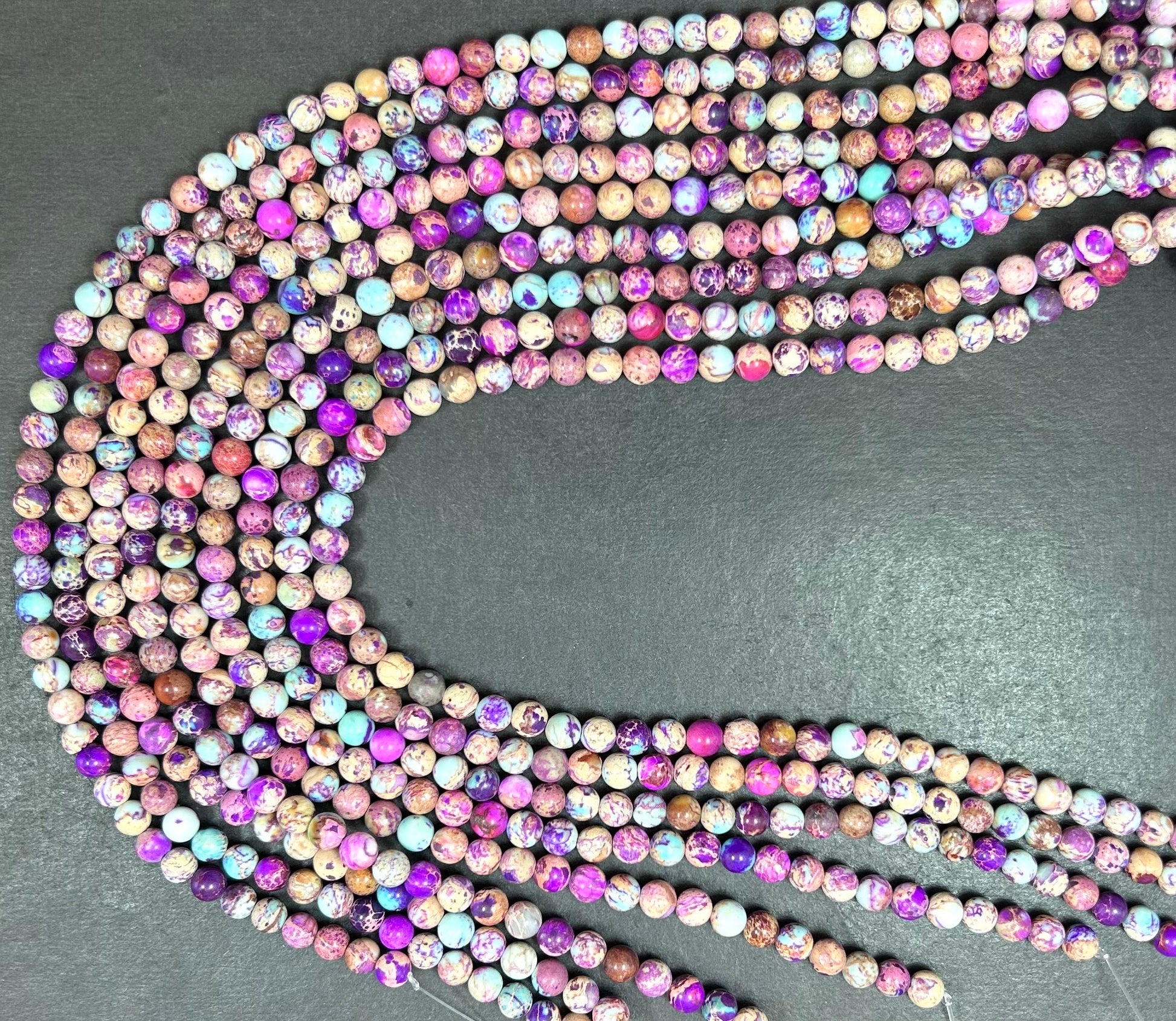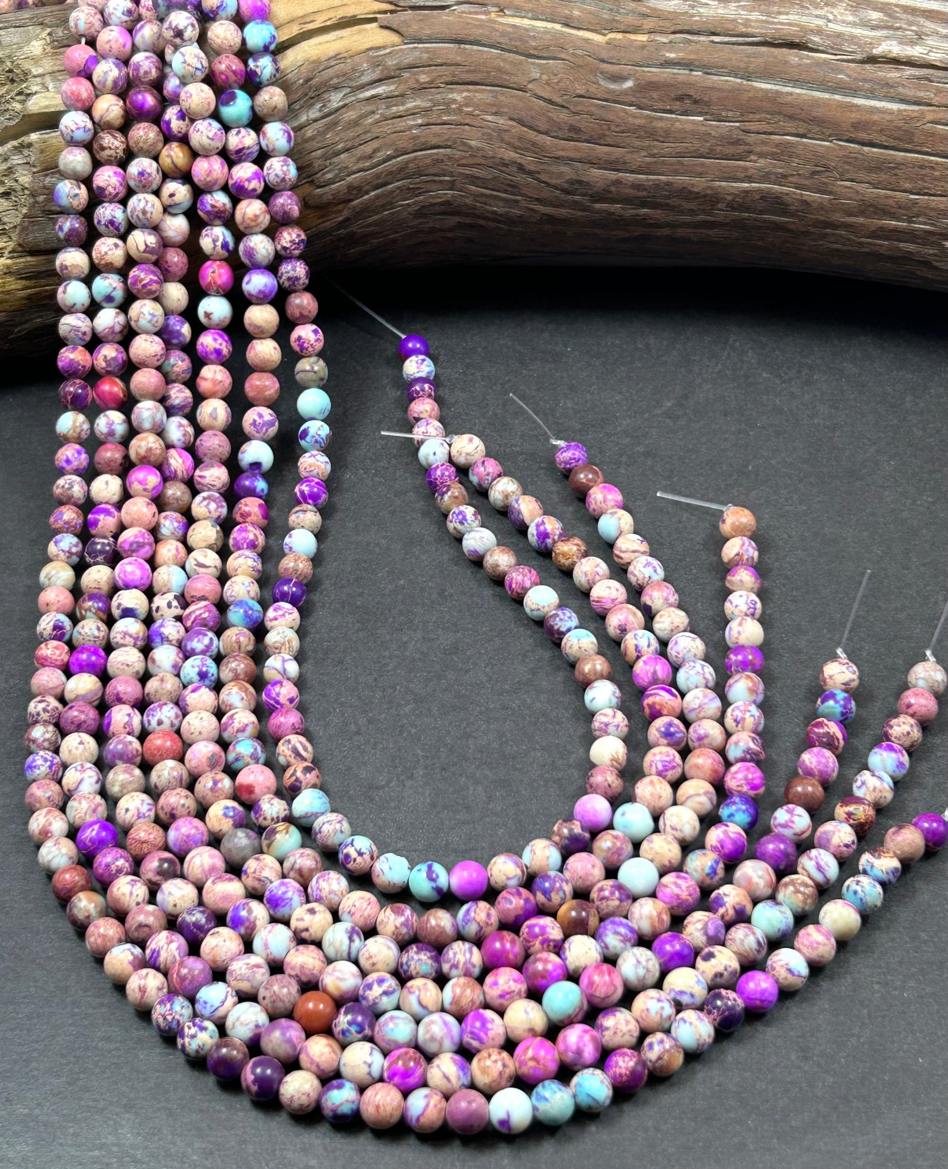 Guaranteed 100% natural gemstone. Stunning natural sea sediment imperial jasper gemstones. Beautiful light blue , purples, fuchsia, with hits of red and beige color sea sediment imperial jasper gemstone beads. Very unique and amazing quality. Loose beads great for jewelry making and beading!