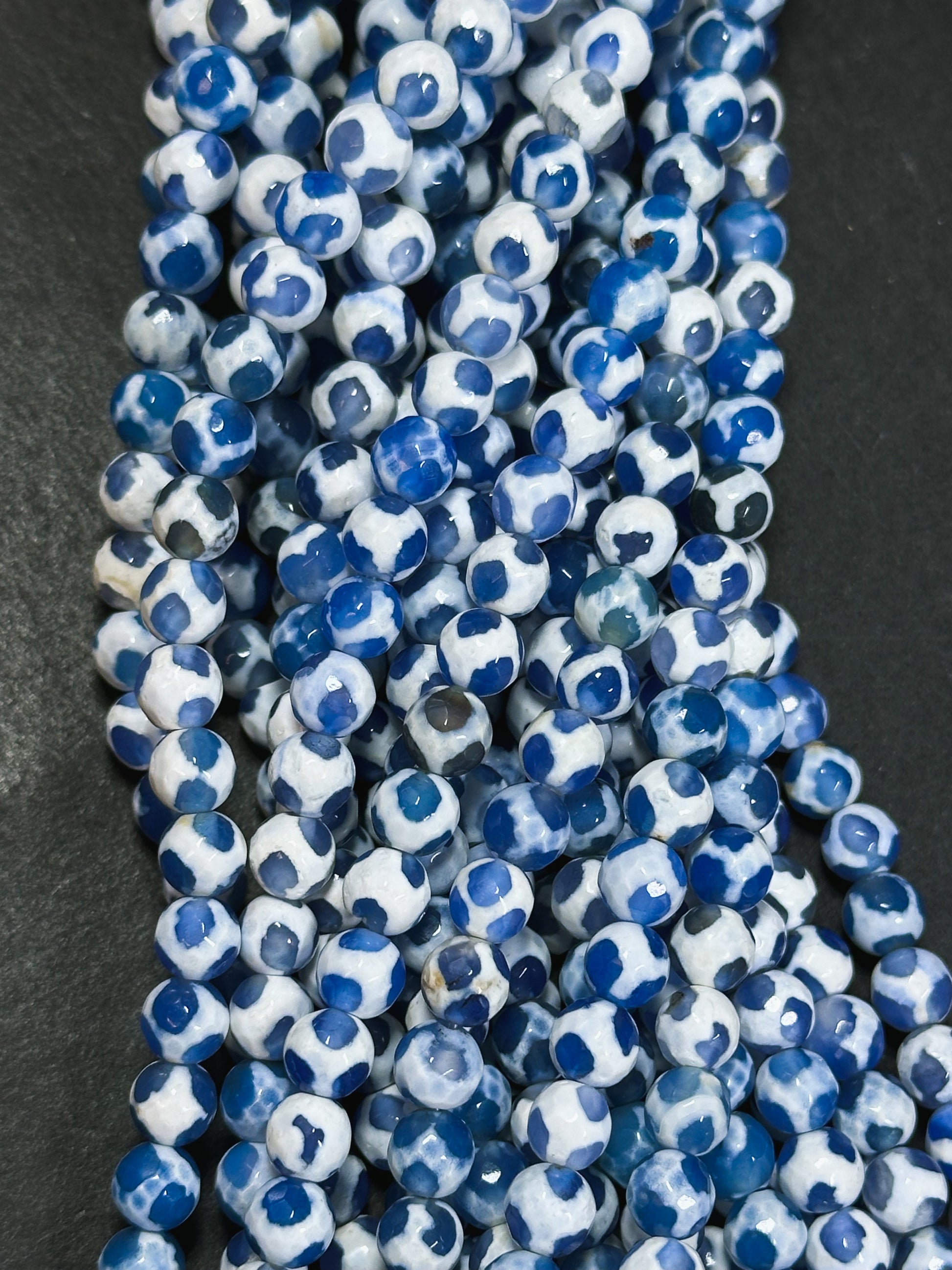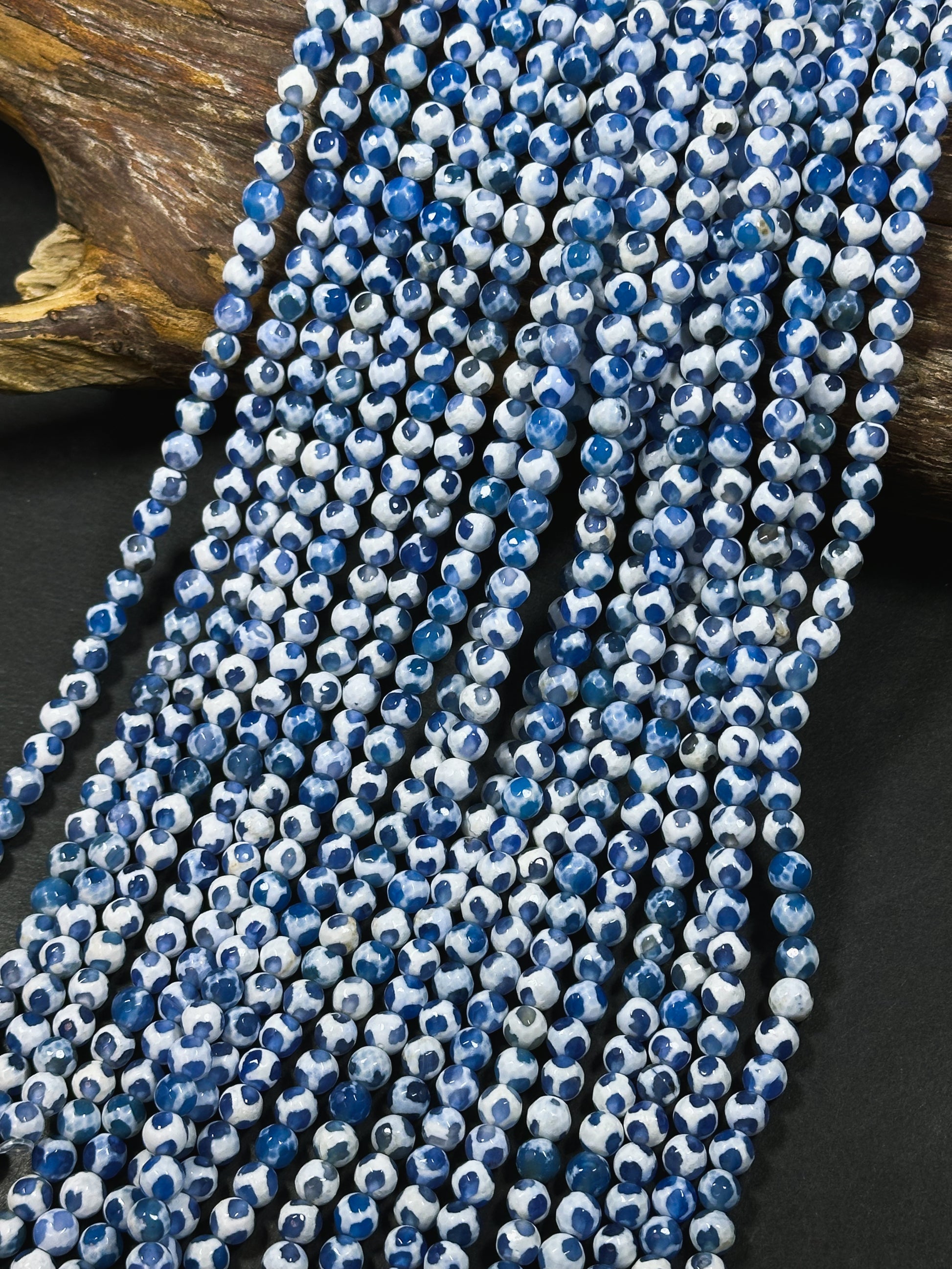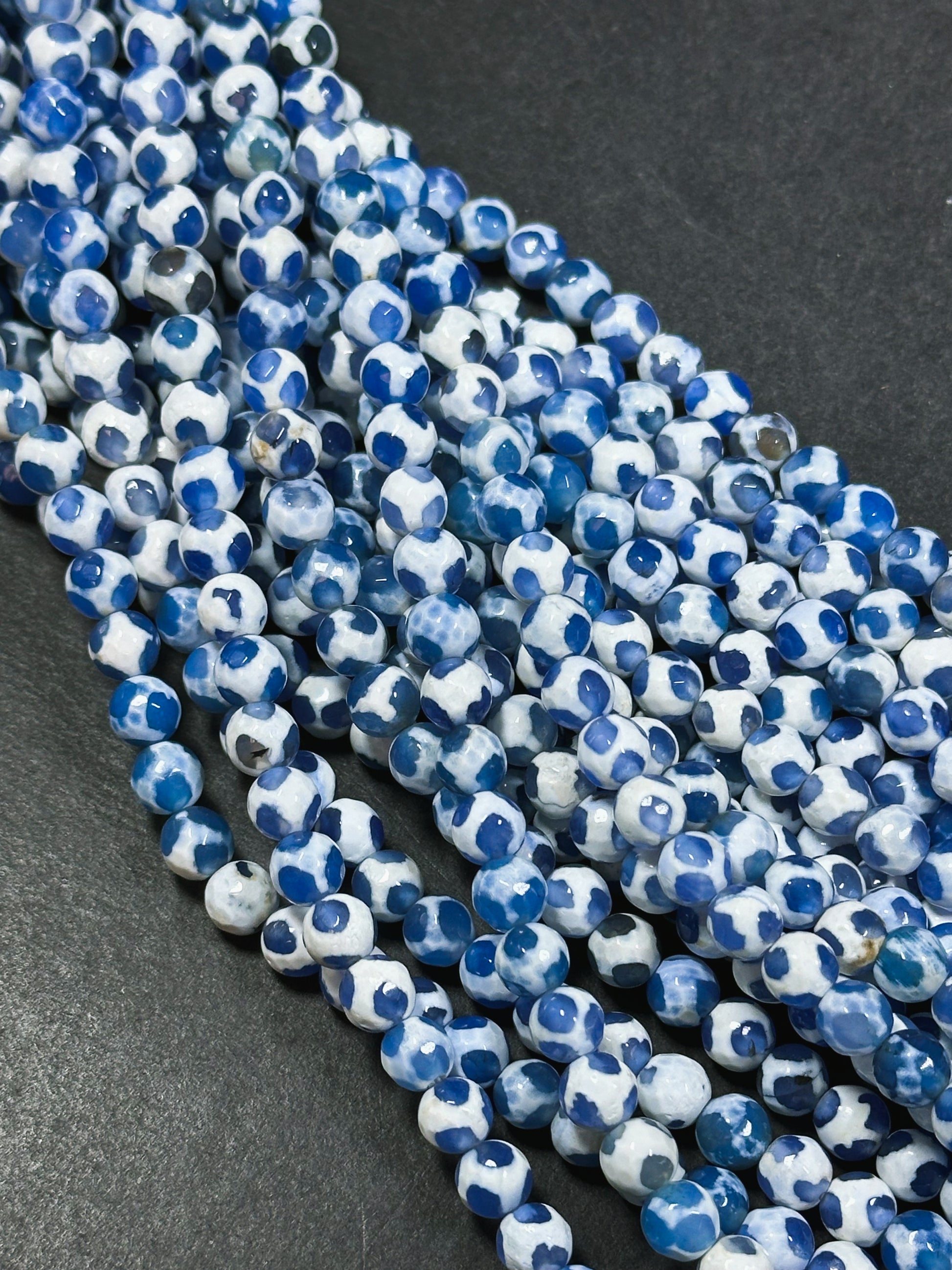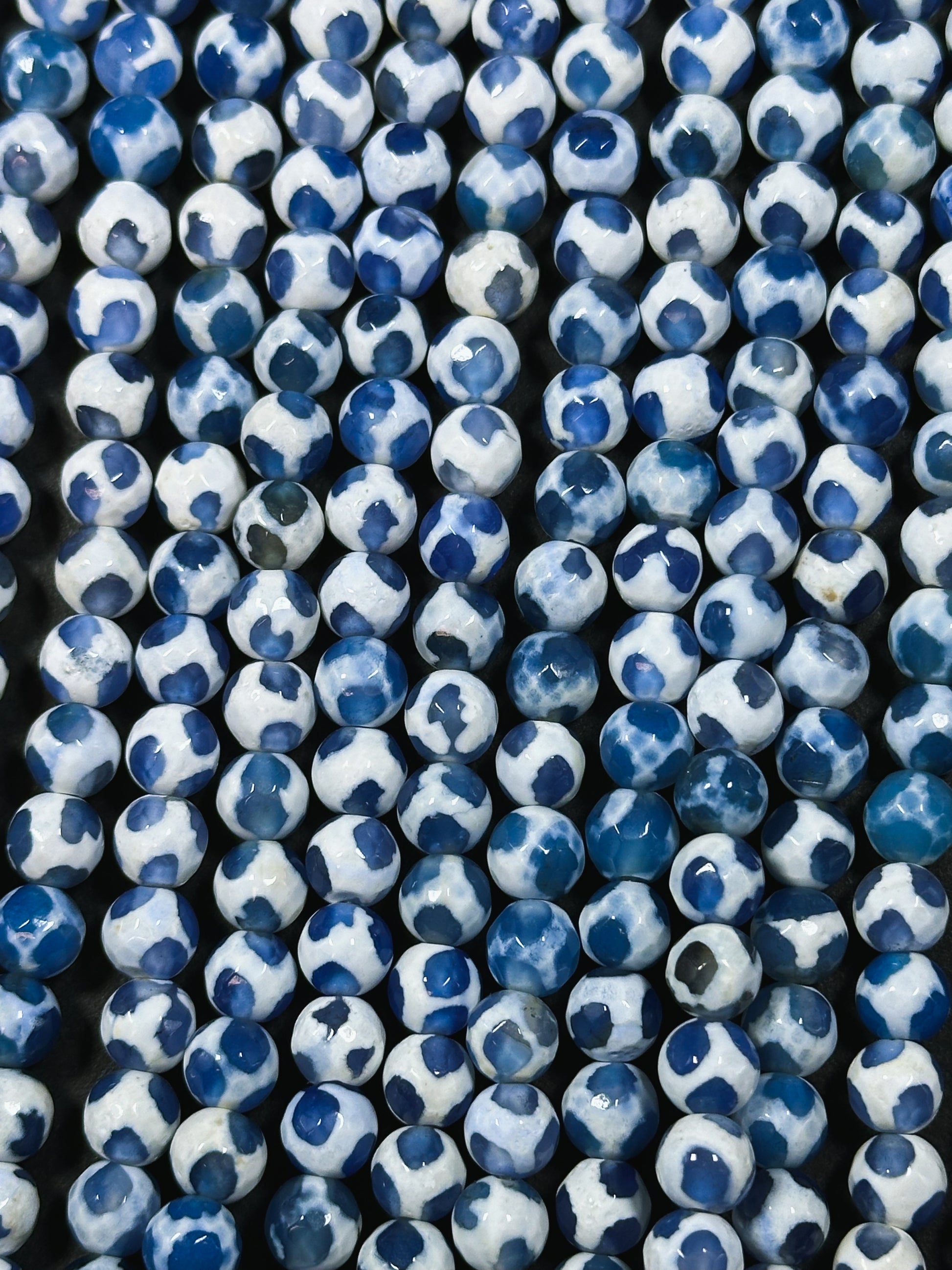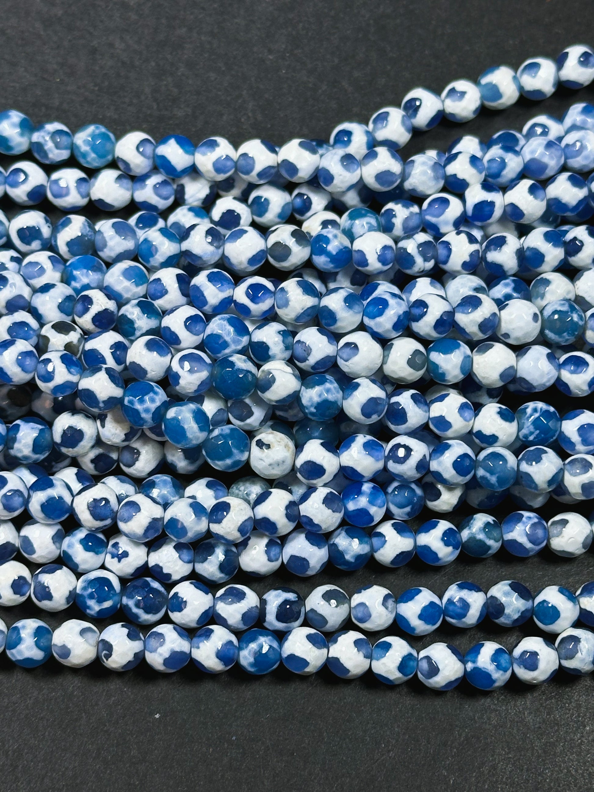 Natural Tibetan Agate Gemstone Bead Faceted 6mm Round Beads, Beautiful Hand Painted White Blue Soccer Ball Design Agate Bead Full 15" Strand