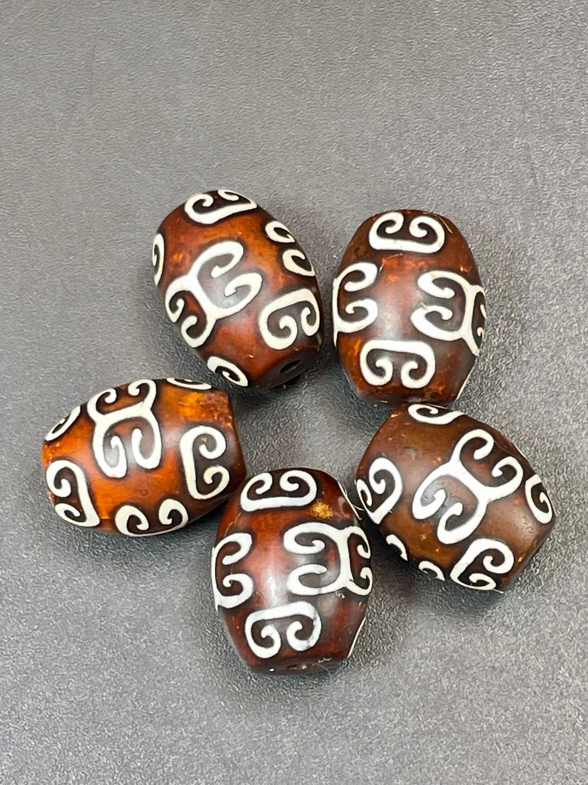 Natural Tibetan Agate stone bead. 12x15mm Barrel shape. Gorgeous brown color with handprinted designs. Great Tibetan gemstone bead pendant!