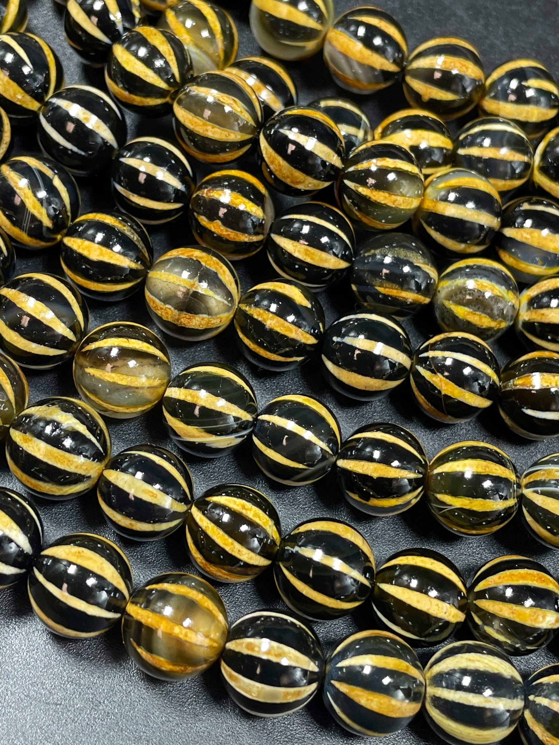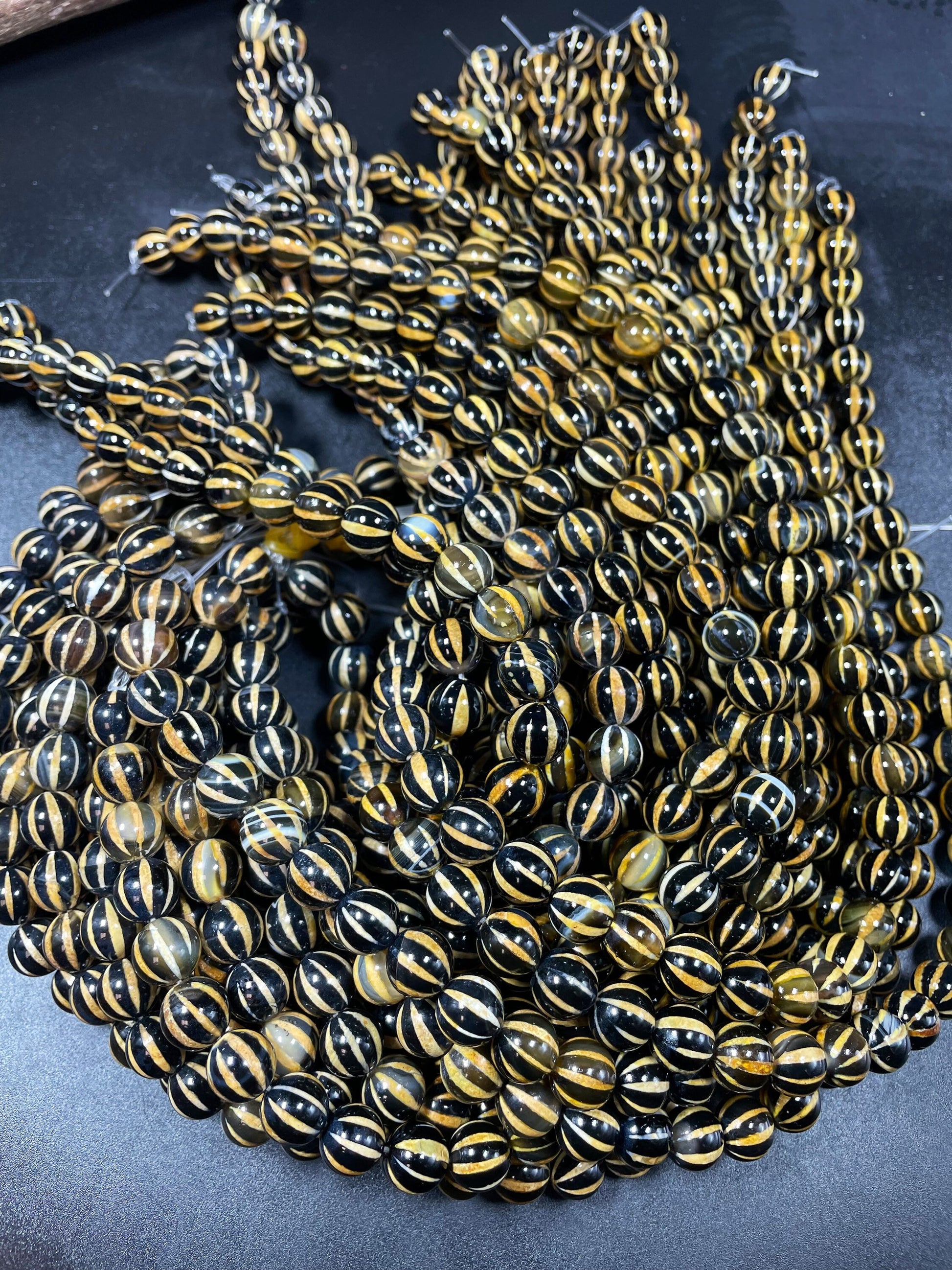 Natural Tibetan Gemstone Bead 6mm 8mm 10mm Round Bead, Gorgeous Black Yellow-Orange Dzi Agate Striped Gemstone Beads