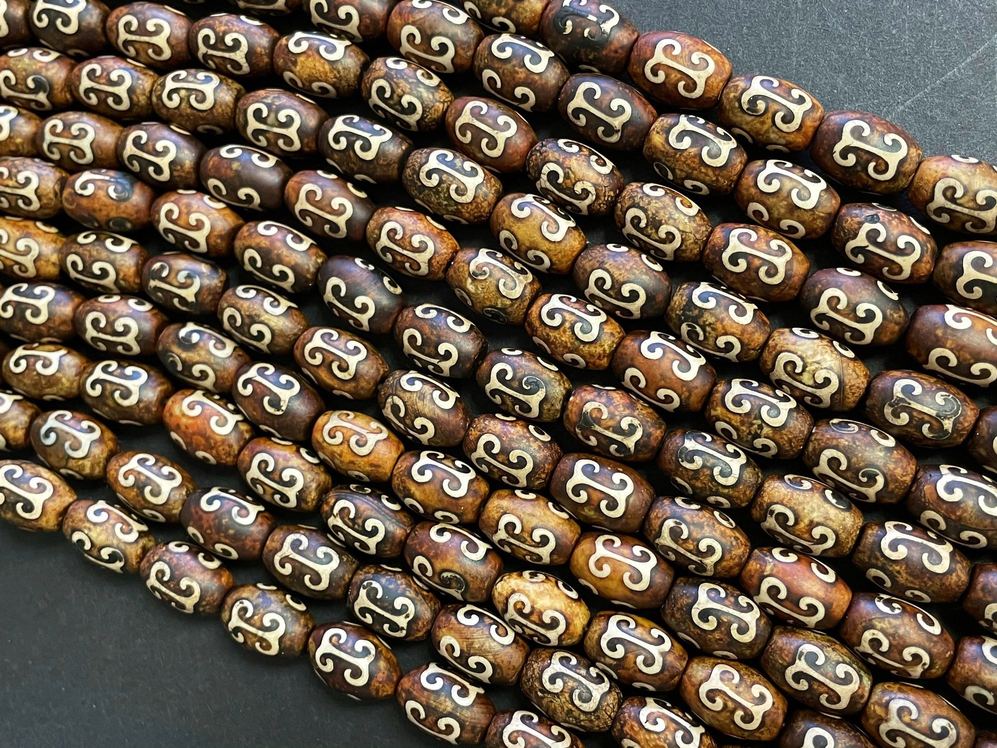 Natural Tibetan Gemstone Bead 7x12mm Tube Shape Bead, Brown Hand Painted Tibetan Gemstone Bead 15.5"