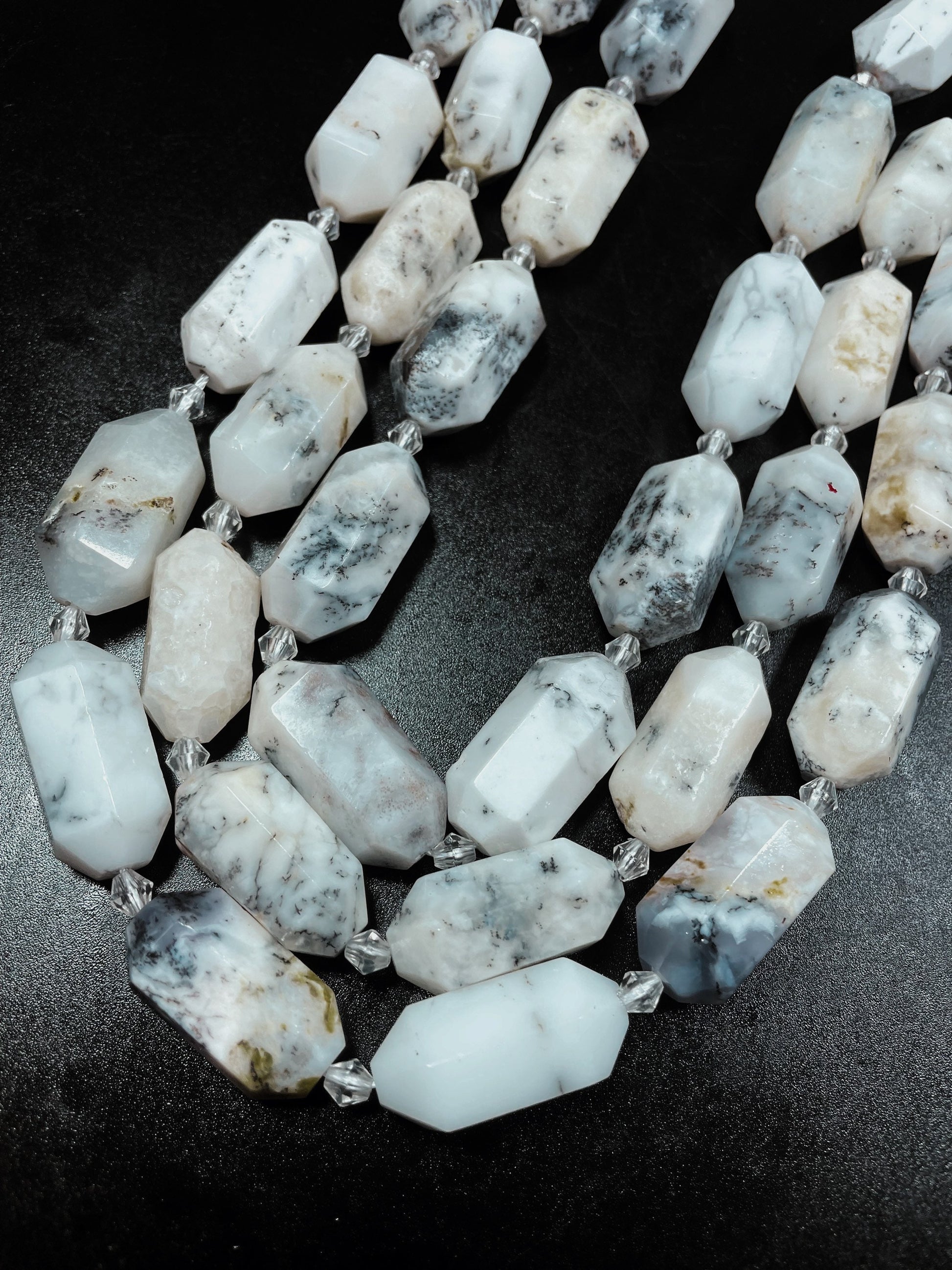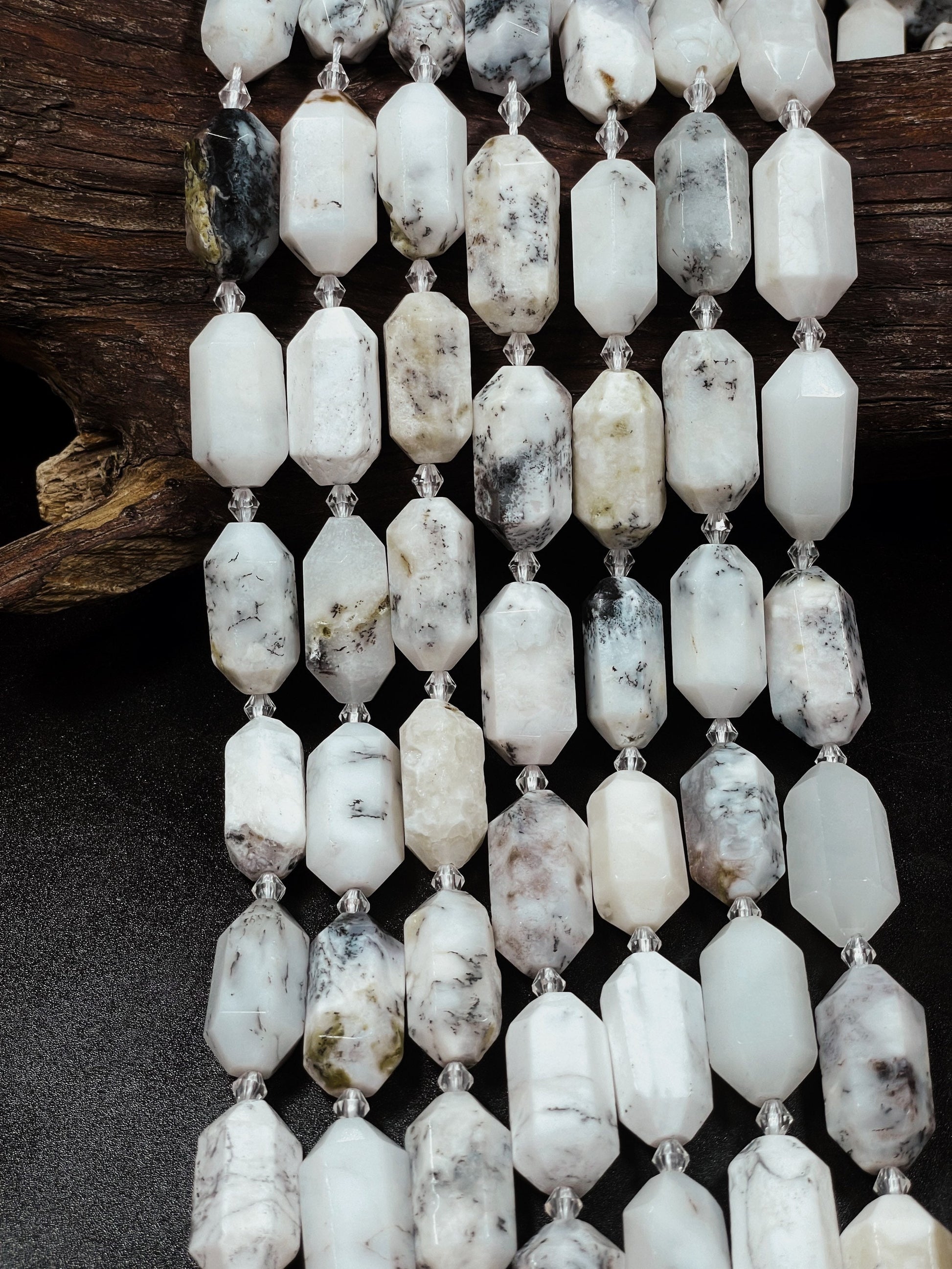Natural White Opal Gemstone Bead Faceted 13x27mm Barrel Shape, Gorgeous Natural White Color w/ Black Points, 15.5" Strand